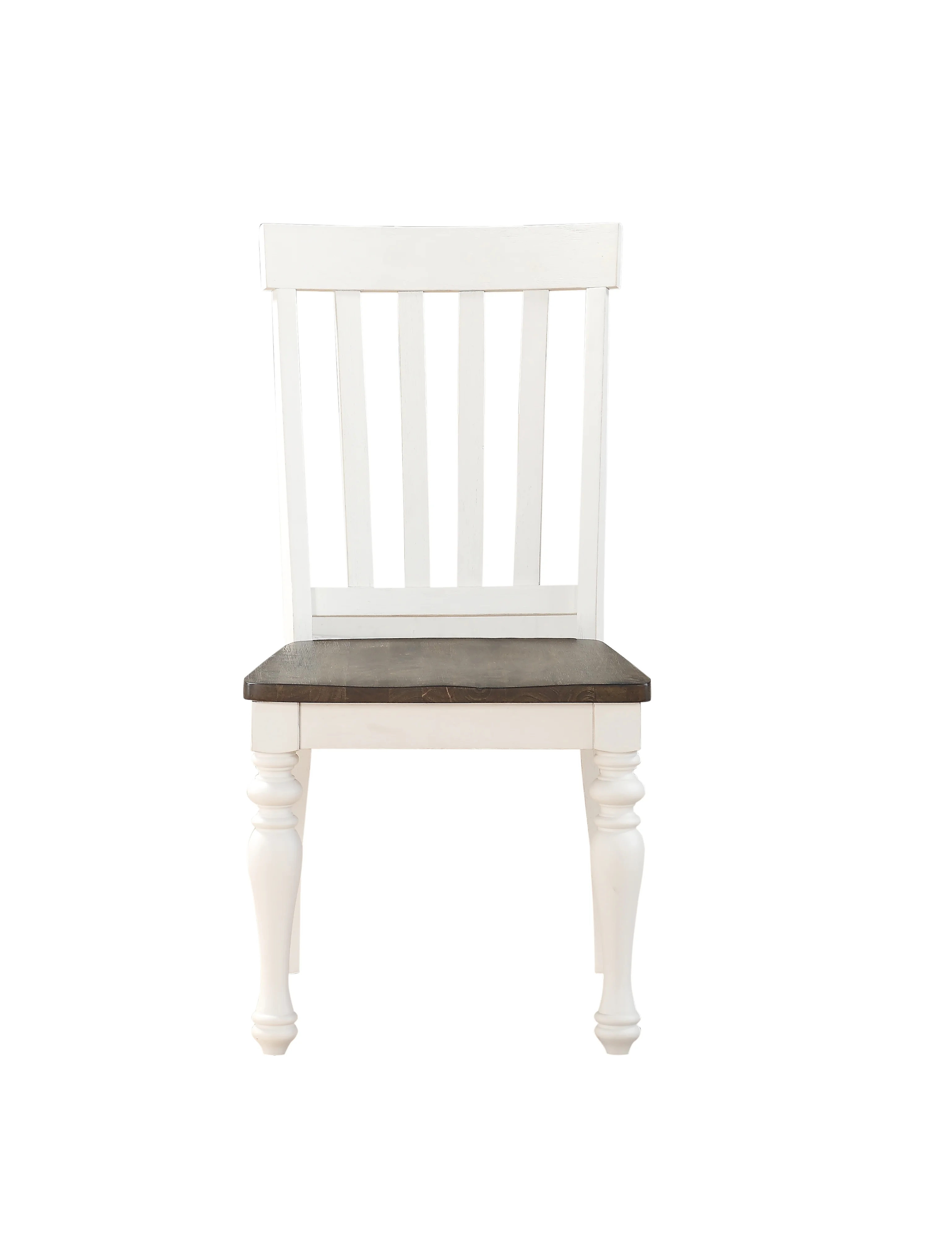 moreThis dining side chair has a timeless style with turned legs, a slat backrest, and a wonderful two-tone finish.