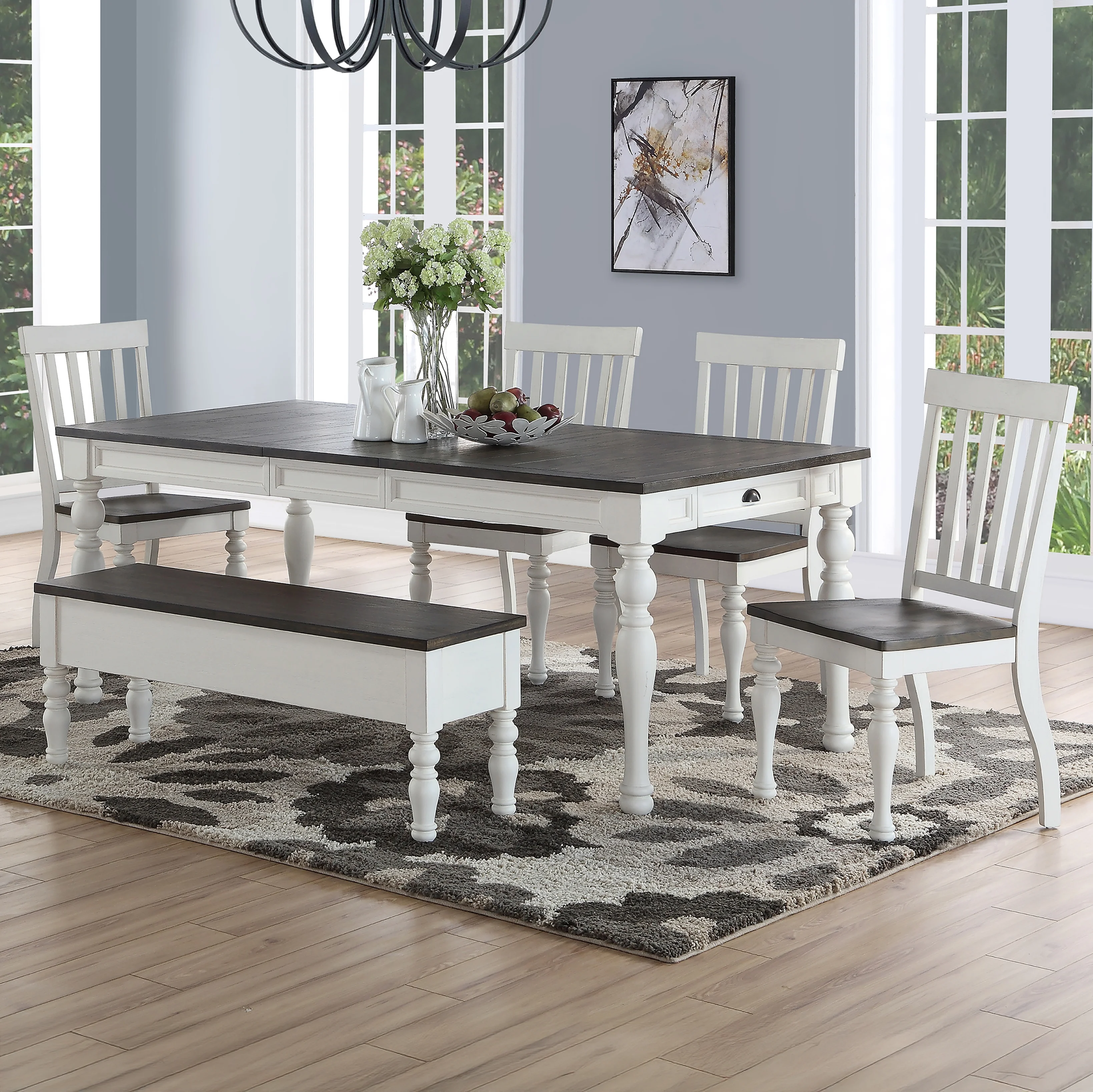 This farmhouse dining room collection features timeless designs with turned legs and a light two-tone finish. Perfect for a breakfast nook or smaller dining room, the collection will be an easy addition to any home with its versatile style.