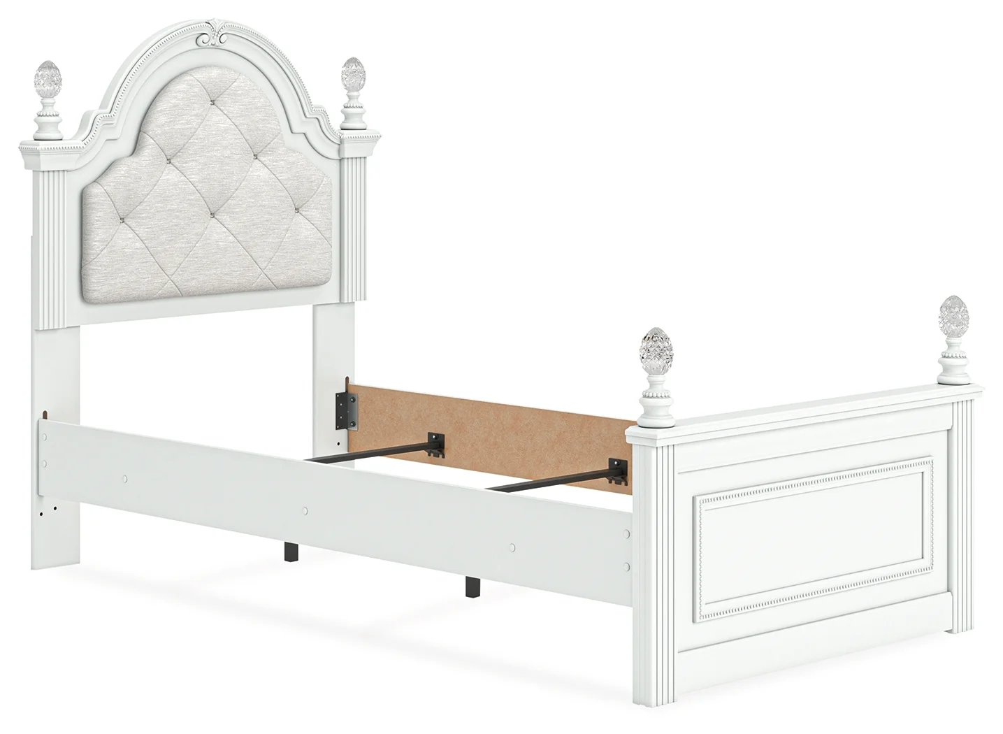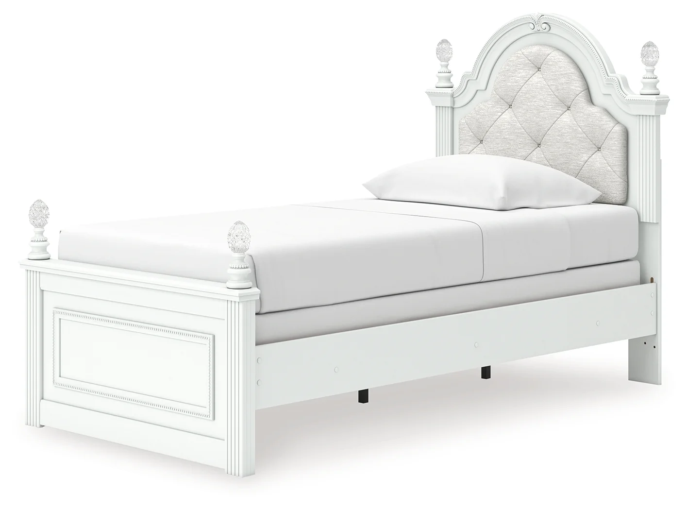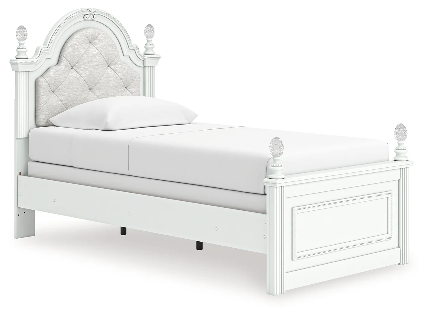 moreFit for a princess. This twin upholstered panel bed’s crisp matte white finish pairs with charming ornate beading and sumptuous button-tufted upholstery—perfect for your girly girl. Decorative ball tops and multicolored LED lighting in the headboard are the crowning touches to make your little one feel like royalty.