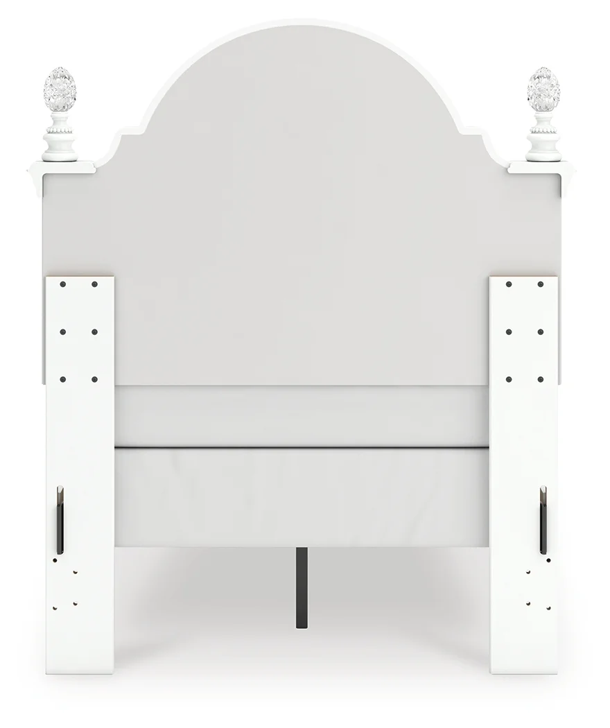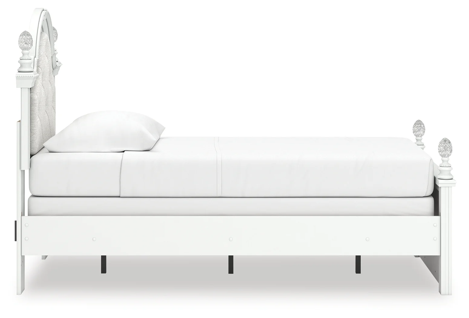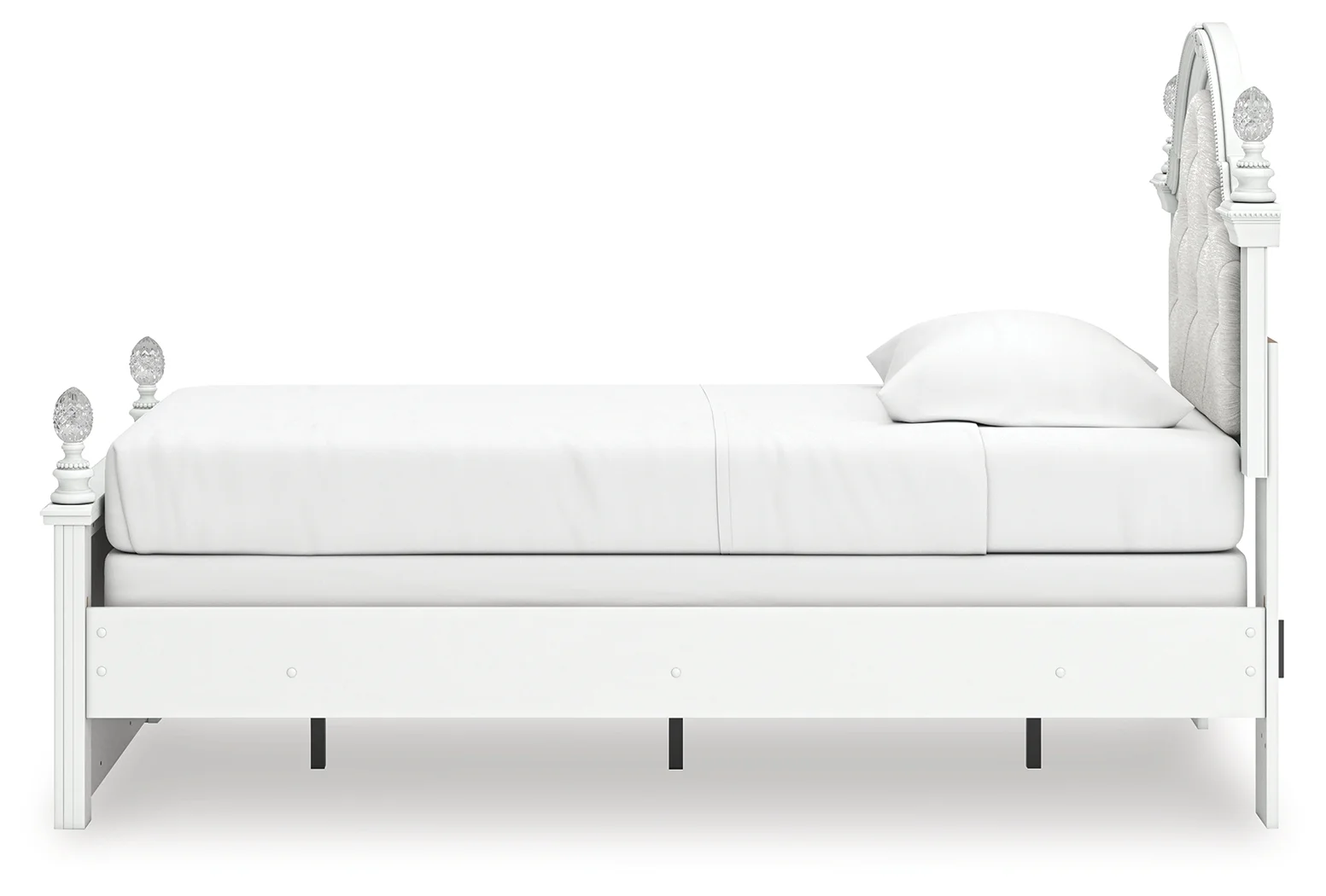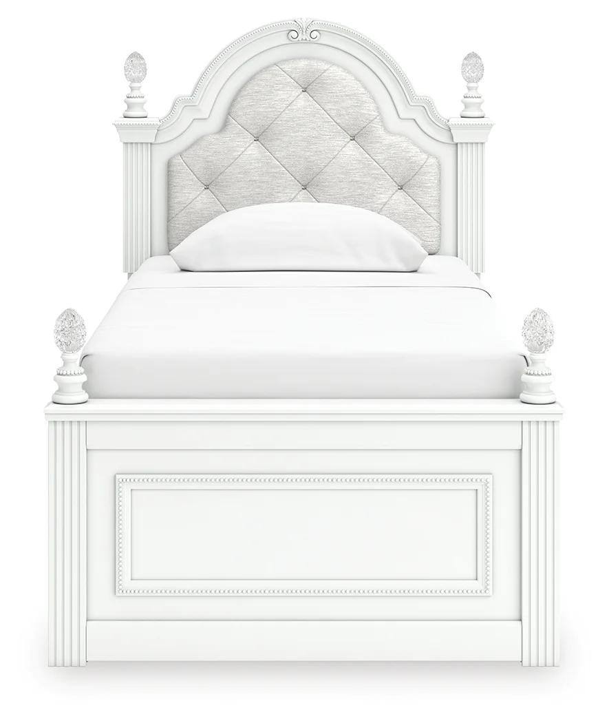 moreFit for a princess. This twin upholstered panel bed’s crisp matte white finish pairs with charming ornate beading and sumptuous button-tufted upholstery—perfect for your girly girl. Decorative ball tops and multicolored LED lighting in the headboard are the crowning touches to make your little one feel like royalty.
