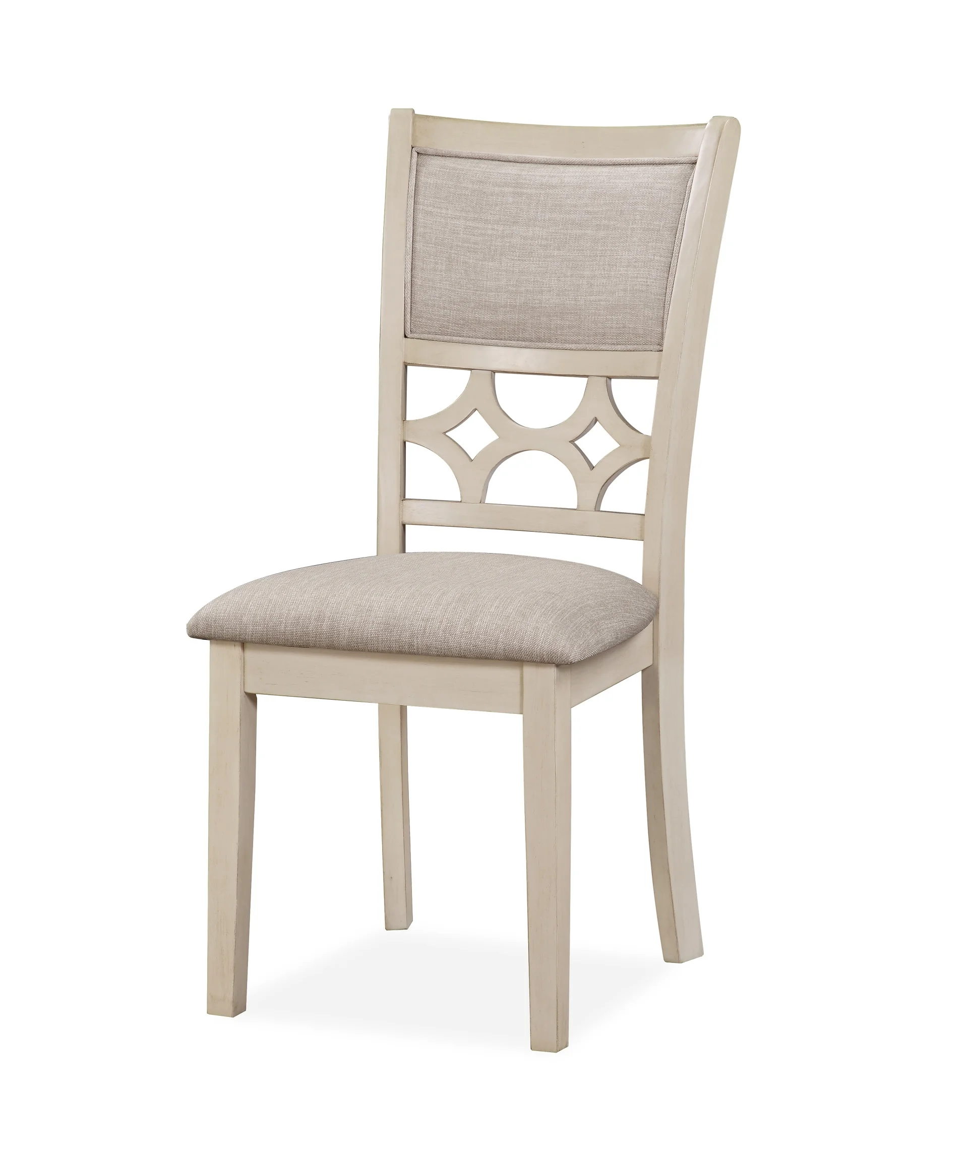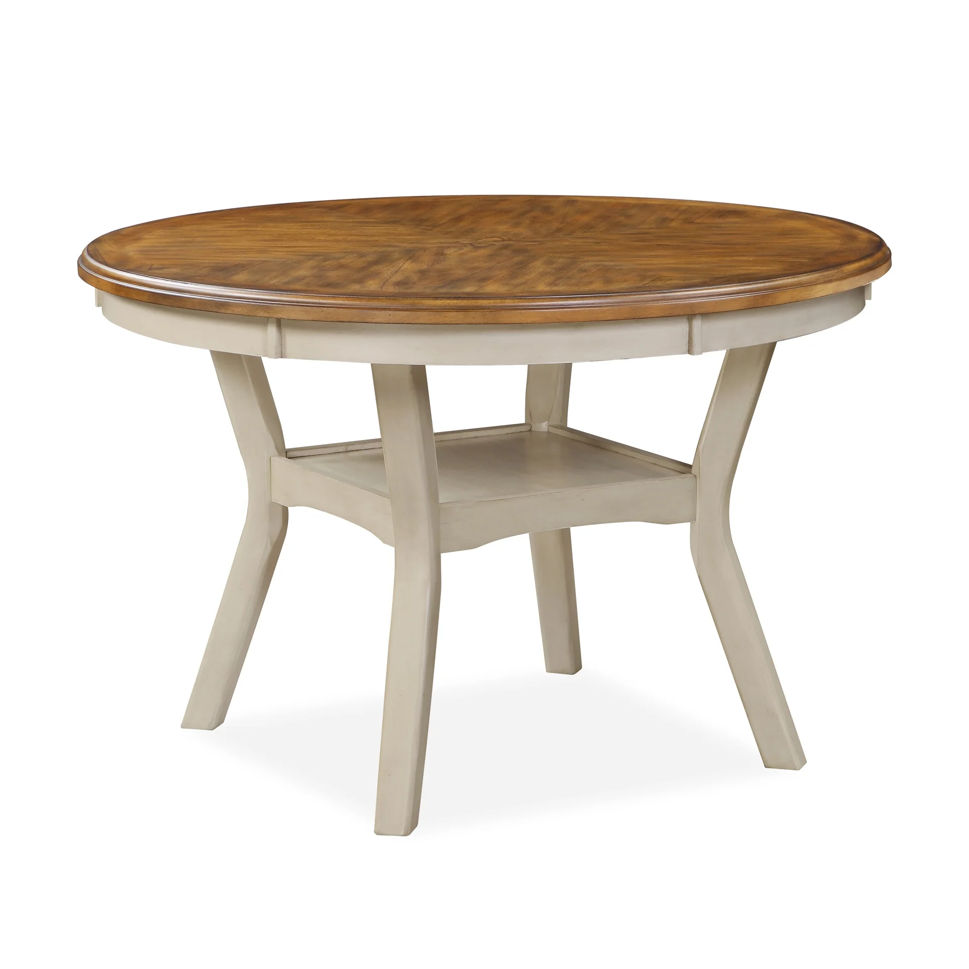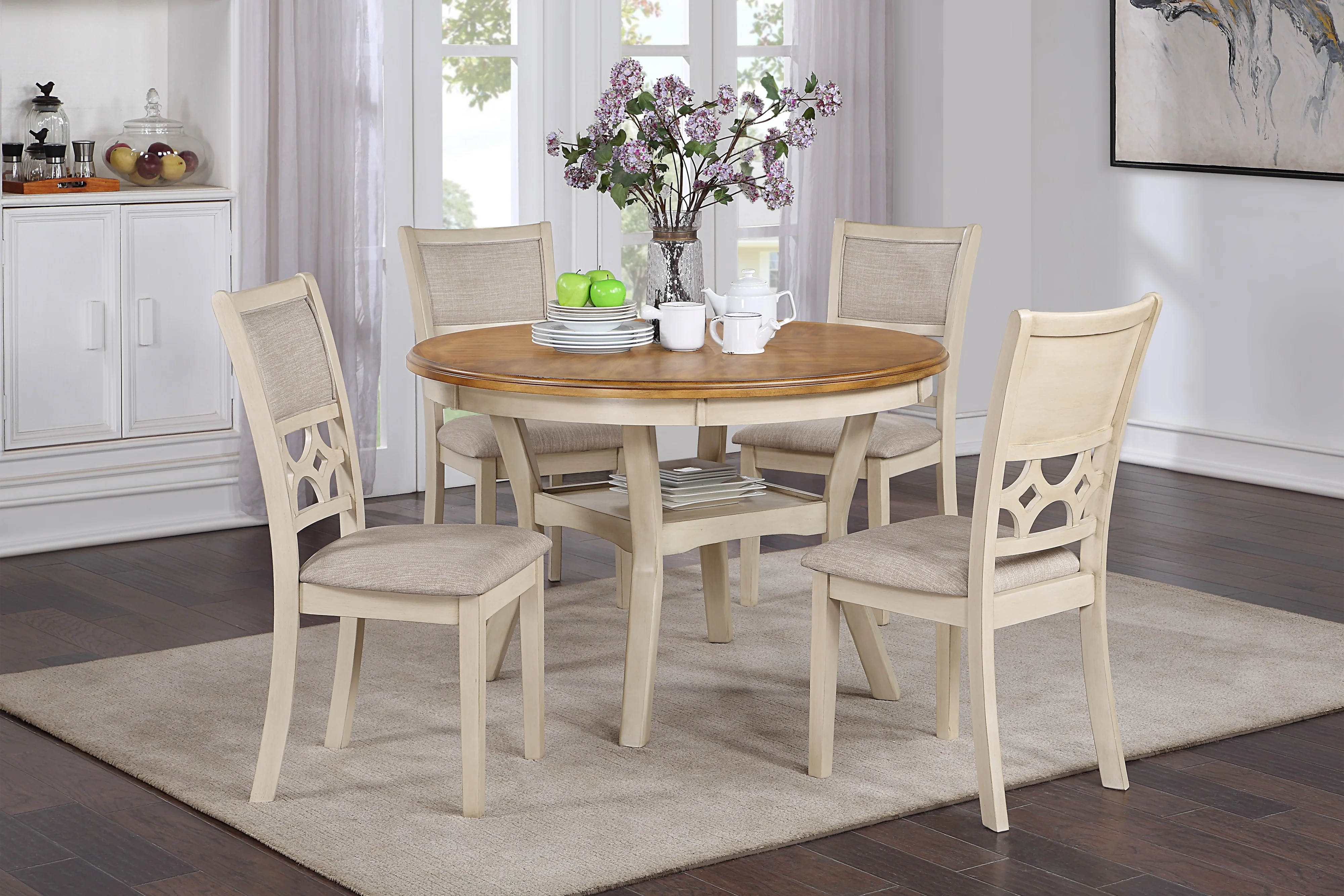 moreThe farmhouse appeal of the Mitchell 5 Piece Dining Table and Chair Set is beautifully created with durability and comfort in mind. This dining set provides spacious seating for four and a handy storage shelf located under the table top to display dinnerware or decor. The dining table apron, table legs and dining chair legs are crafted of solid Rubberwood to add strength and stability. The distinctive reverse diamond Mindi wood veneer dining table top accents the beautiful wood grains. A multi-step vintage brown table top and creamy bisque chairs and table base create the heirloom appeal of this family gathering table. The set includes four comfortable dining chairs with 100% polyester beige seat cushions and backs. The final touch is Mitchell's signature double diamond detail on the chair back, adding a touch of distinction to your dining room or kitchen.