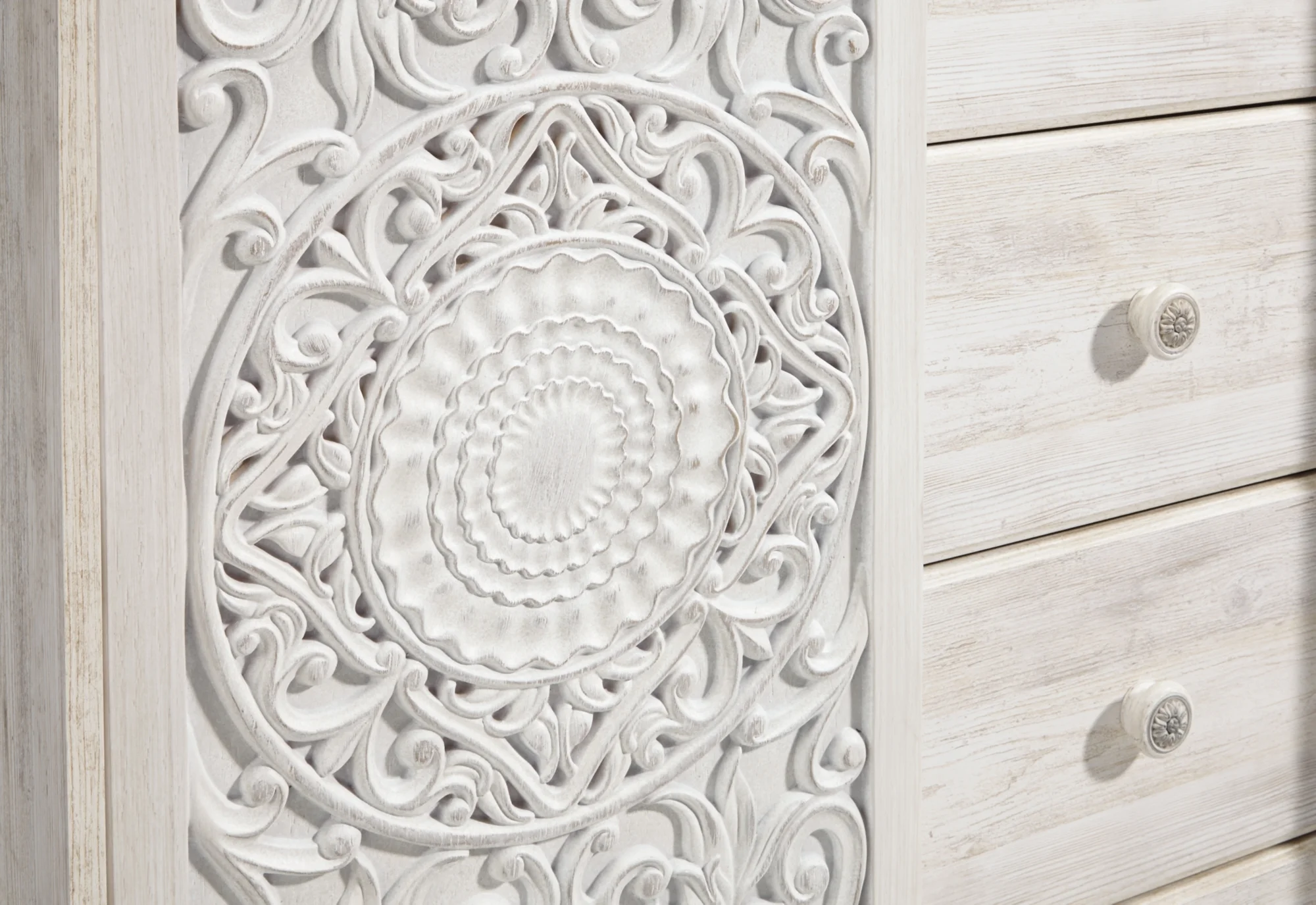 moreShowcase your trend-setting spirit with this bed. Inspired by bohemian tapestries, exquisite carved medallion pattern is a testament to boho-chic style. Whitewash finish sets a foundation for a room bursting with personality. Chest and nightstand included.