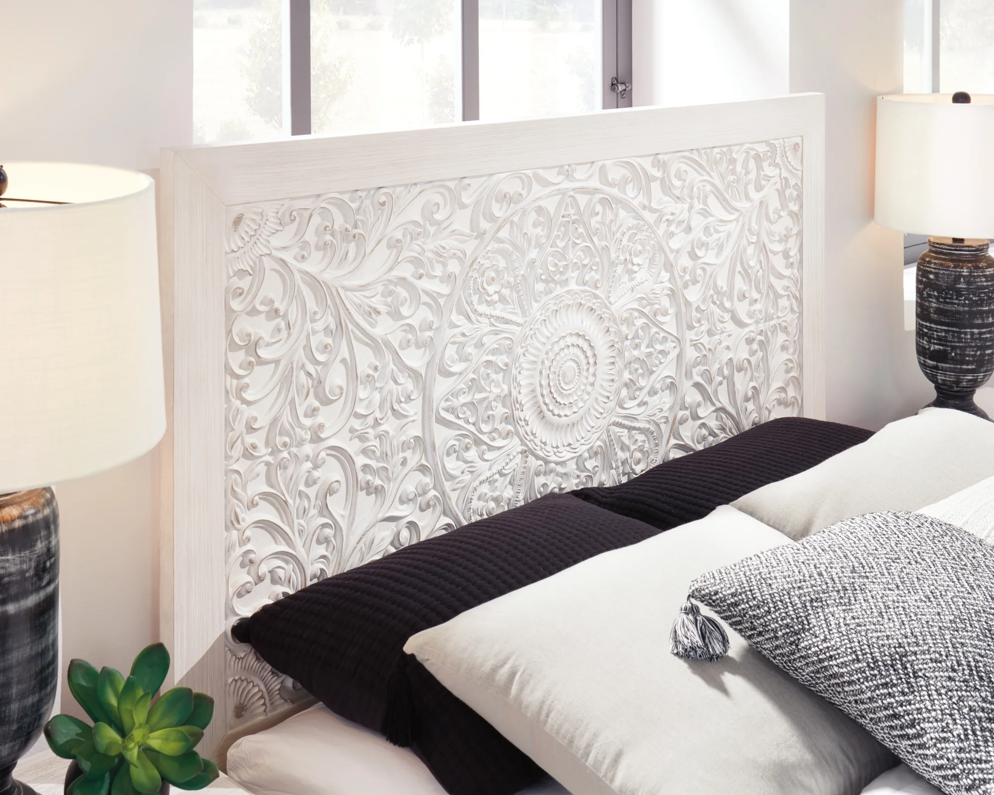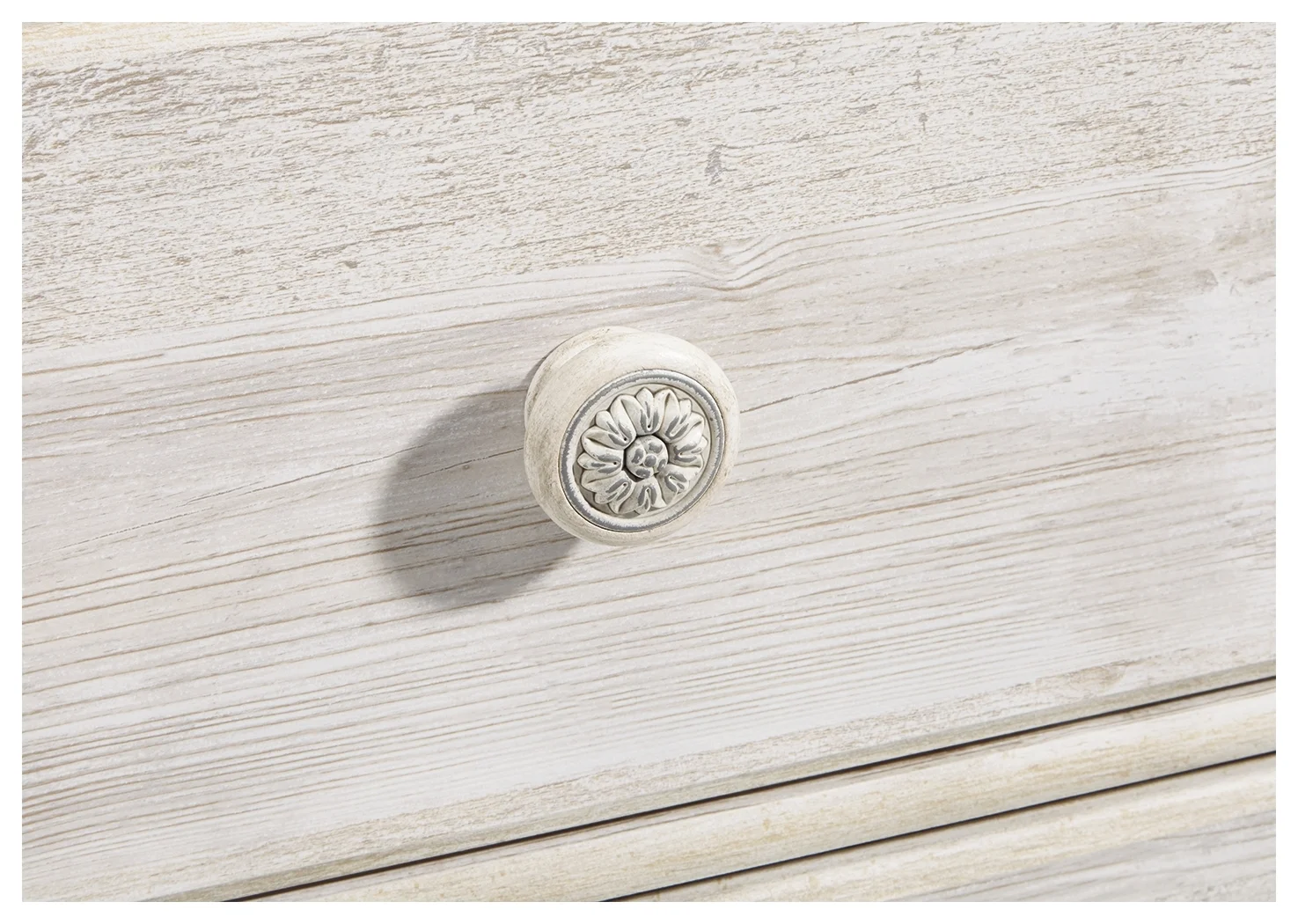Your young trendsetter can live out her free spirit with this uniquely chic queen bed. Exquisite carved medallion pattern is a testament to true style. Charming whitewashed finish sets a foundation for a room bursting with personality. Headboard legs have four height options to grow with your child. Chest and nightstand included.