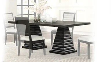 moreThe Plateau Dining Table is a perfect blend of enduring quality and refined style. Constructed from solid Rubberwood and premium engineered woods, it delivers the strength and reliability of real wood, enhanced by the timeless elegance of Oak wood veneers. The rich, multi-step espresso finish highlights the natural grain and unique characteristics of the wood, while subtle distressing techniques, including rasping, brushing, and burnishing, give it a distinctive, heirloom quality. The table’s bold geometric lines and statement pedestal base fuse classic rustic charm with contemporary design, making it a standout centerpiece in any dining space. With its expansive 78" surface, this table comfortably seats up to 8 guests, making it the ideal setting for family dinners and festive celebrations. Invest in the Plateau Dining Table for a dining experience that combines durability, style, and functionality, creating a space where memories are made.