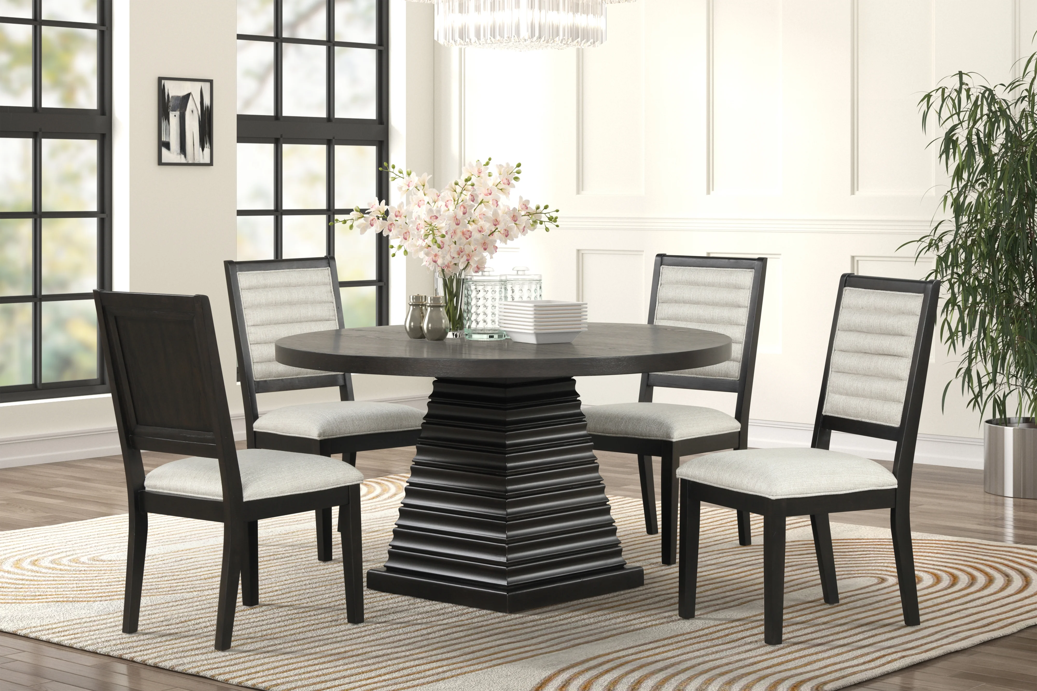 This contemporary round dining table is perfect for casual meals and everyday gatherings. Its pedestal base provides a sturdy foundation, while the round table top creates a sense of warmth and intimacy. The table's dark wood tone, finished in a rustic espresso color, adds a touch of sophistication to any kitchen or dining area.