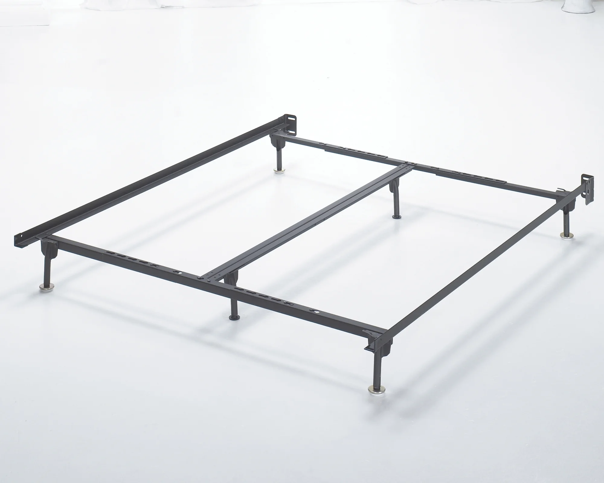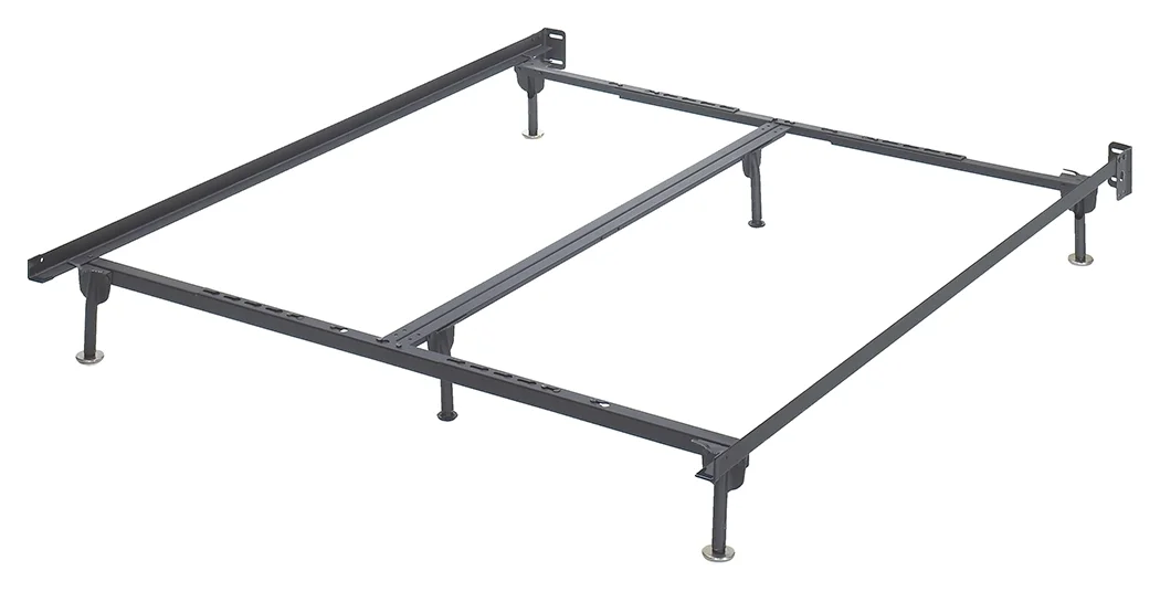 Made of metal, Assembly required, Protective floor glides, Center support rail, Attaches to most queen/king/California king headboards, Compatible with queen/king/California king mattresses and box springs, Uses 1/4" bolts; not included