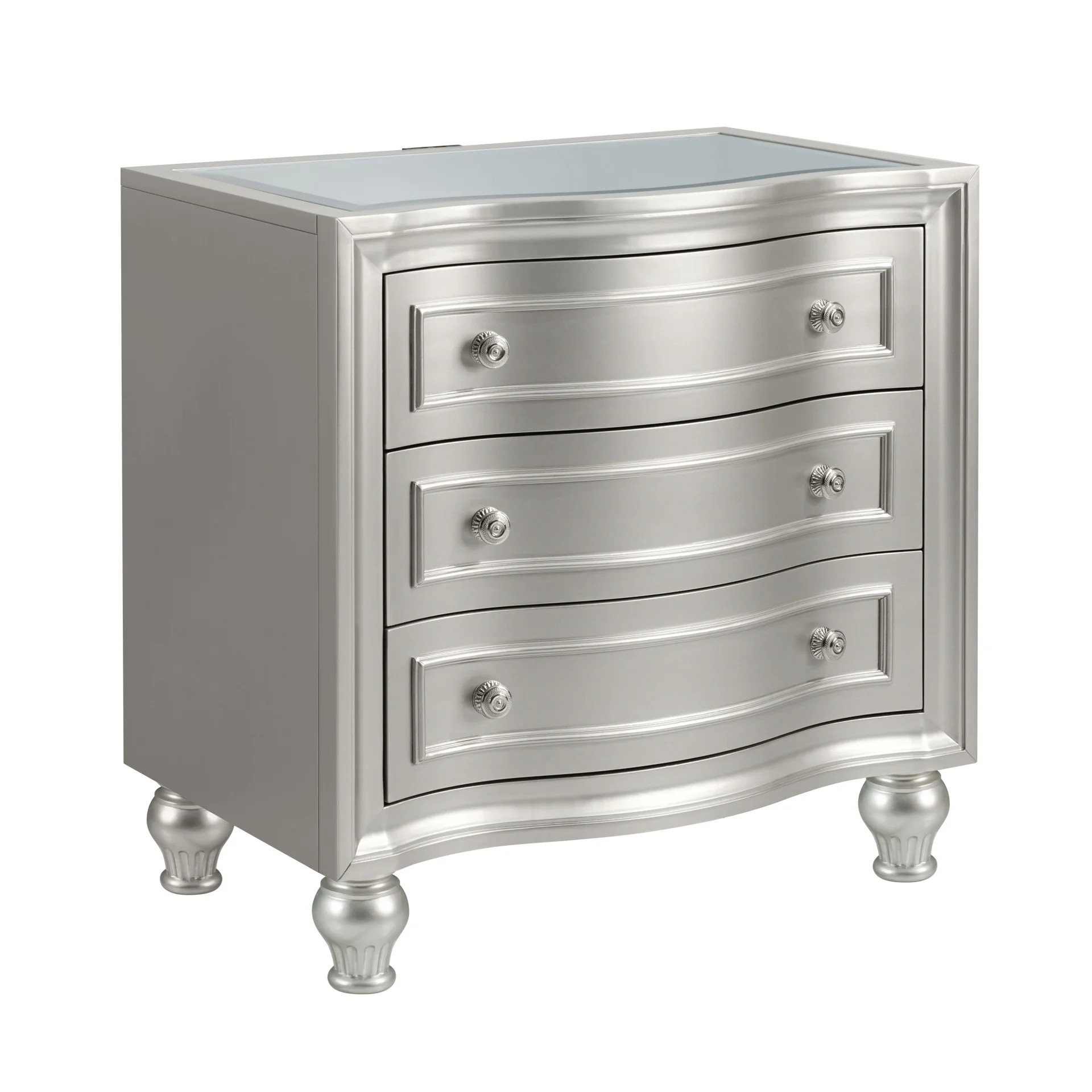 moreIntroducing the Reflection Nightstand in Silver, expertly crafted from solid Pine and high-quality manufactured wood to ensure enduring strength and durability. Its glamorous matte silver finish exudes sophistication, accentuating the mirrored top and silver drawer pulls, adding a touch of elegance to any bedroom decor. Experience luxurious functionality with a mirrored top, bowfront drawers, sumptuous lavender velvet lining, picture frame moldings, and turned bun feet, seamlessly blending classic charm with modern flair. Inside, discover meticulous craftsmanship with English dovetail joinery, full extension drawer glides, finished interiors, and select velvet-lined drawers to safeguard delicate items. Enjoy extra upgrades such as the built-in USB charging port and cedar-lined bottom drawer, offering unparalleled convenience and lifestyle functionality. This nightstand is not just a piece of furniture—it's a marvel of design and practicality, destined to enhance your bedroom space with style and functionality.