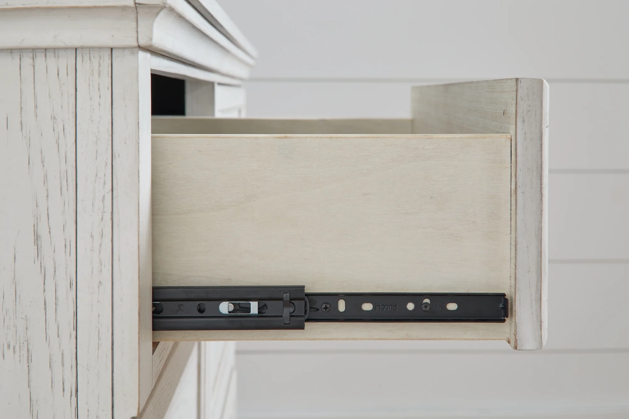 - Antiqued white finish with grain texture