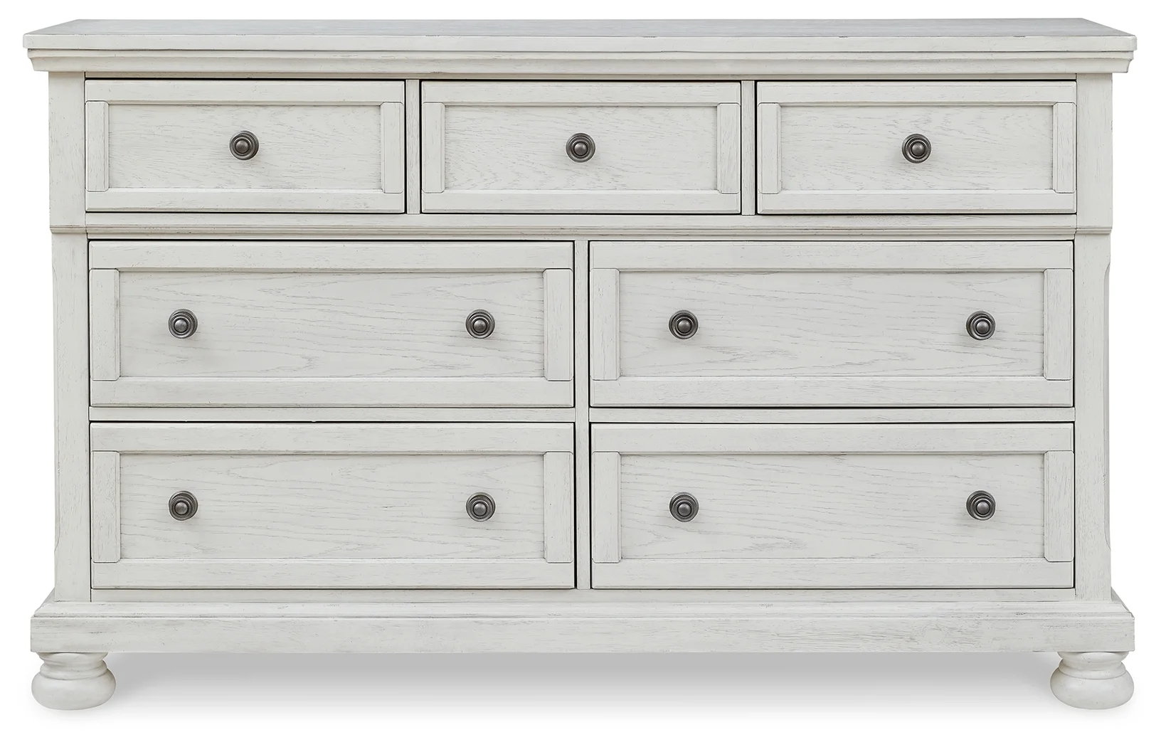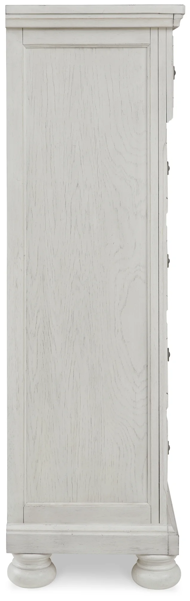 moreElegant, timeless furnishings take your bedroom to the next level. Nothing does that better than this queen panel bed. The antiqued white finish with a wonderful grain texture radiates sophistication, making this the perfect piece to round out the ultimate tasteful bedroom. Set includes a dresser, chest and 2 nightstands.
