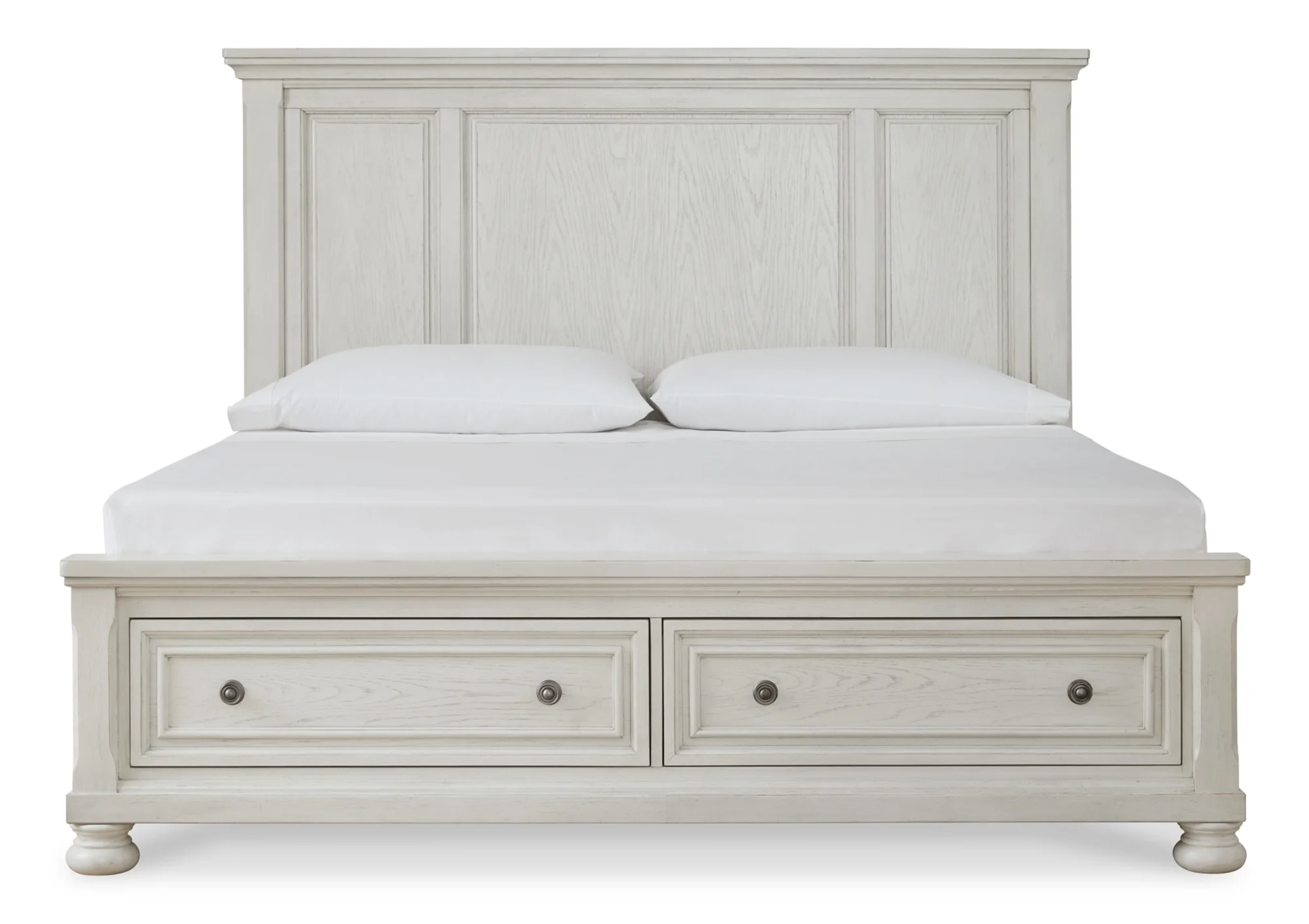 moreElegant, timeless furnishings take your bedroom to the next level. The antiqued white finish with a wonderful grain texture radiates sophistication, while the dark bronze-tone hardware on the case pieces adds an ornate touch.