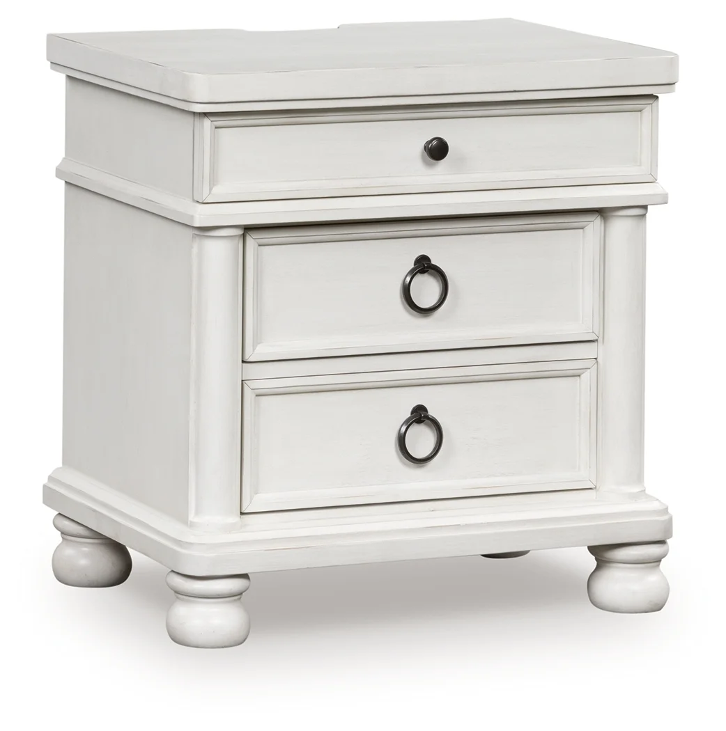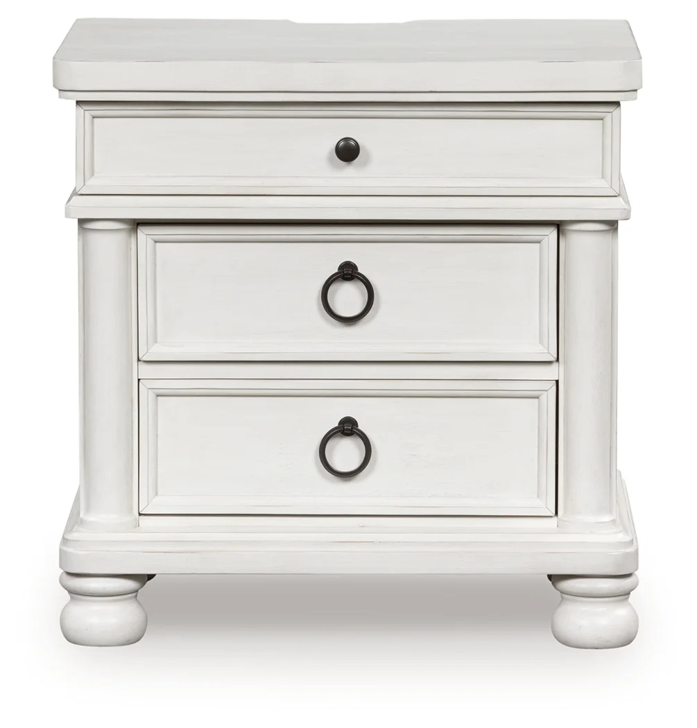 Taking a laid-back approach to casual traditional design, this artfully crafted nightstand combines classic elements with a clean modern approach. Its rubbed antiqued white finish exudes a comfy, timeless appeal that's sure to carry you away to a dreamy time and place. The simple round metal knob and ring pulls on the nightstand's spacious drawers make just the right statement, while an integrated power outlet and USB charging keep your devices powered up overnight.