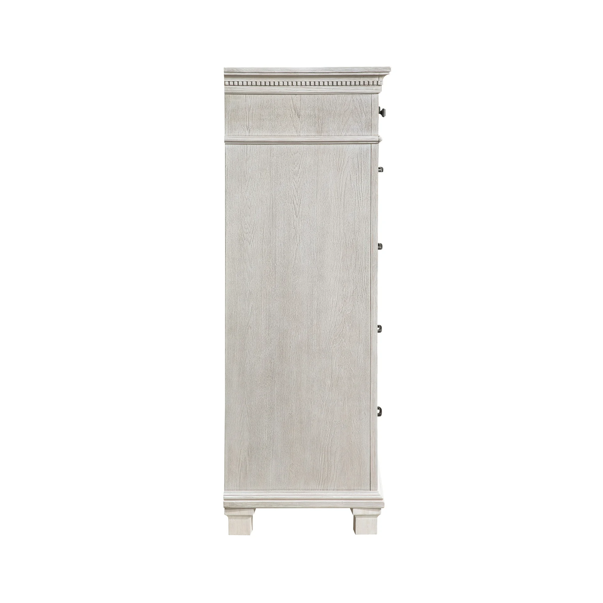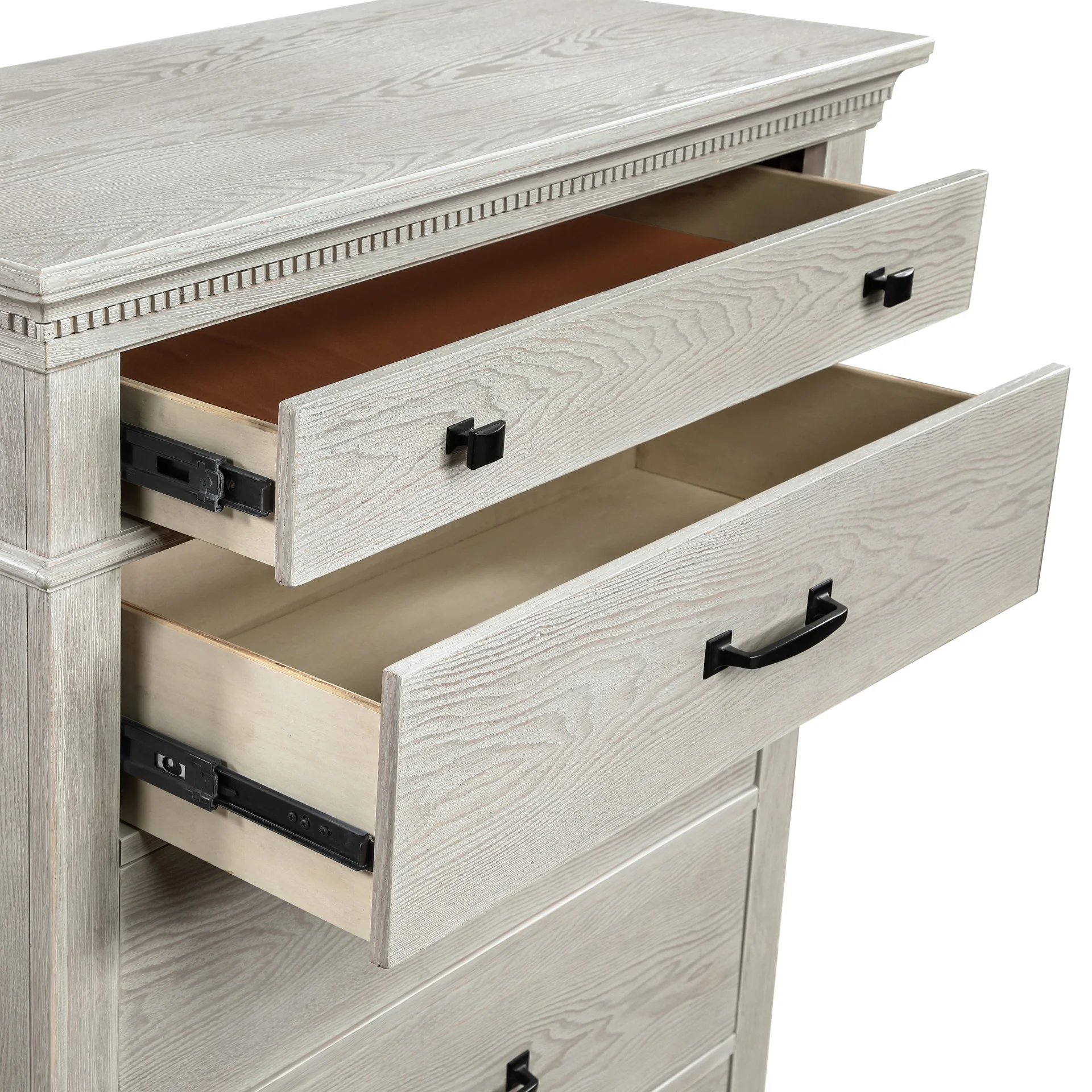 moreThe Silver Sands Chest is built with durable, quality construction using solid pine, manufactured woods, and oak wood veneers, ensuring a strong and stable piece. Its transitional style blends clean, simple lines with a rustic wood finish, creating a calm and inviting atmosphere. The misty gray finish, applied through a meticulous multi-step process, offers a light, weathered look that highlights the natural grain and mineral patterns of the wood. Elegant design features, including a raised base, full return and dentil moldings, and contrasting hardware, add a sophisticated touch. Heirloom-quality drawers with dovetail joinery and three-stage steel ball glides ensure smooth, full-extension operation and can support heavy loads. With five spacious drawers, including a velvet-lined top drawer to protect delicates, this chest provides ample storage for clothing essentials. Combining style, durability, and functionality, this chest is a practical and elegant addition to any bedroom.