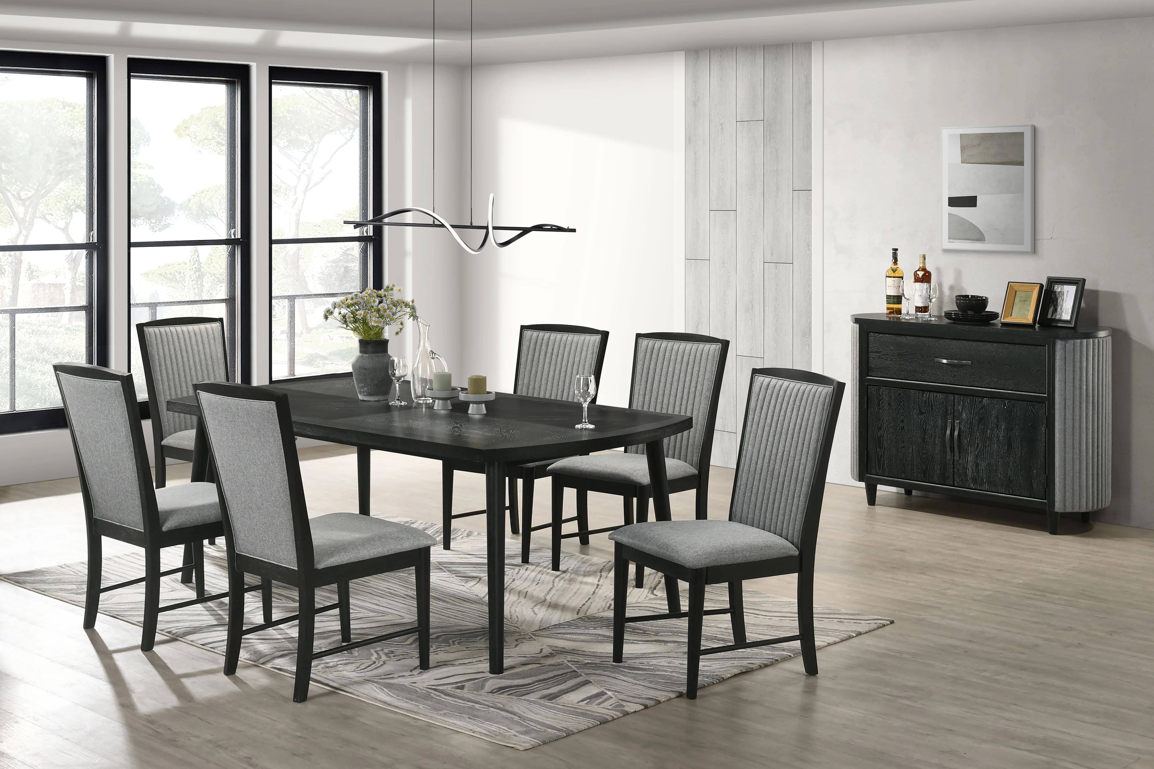 The server includes a generously sized top drawer and a spacious lower compartment, providing plenty of storage for dinnerware, linens, and other dining essentials. The set also includes six side chairs, designed to provide comfortable seating for six people.