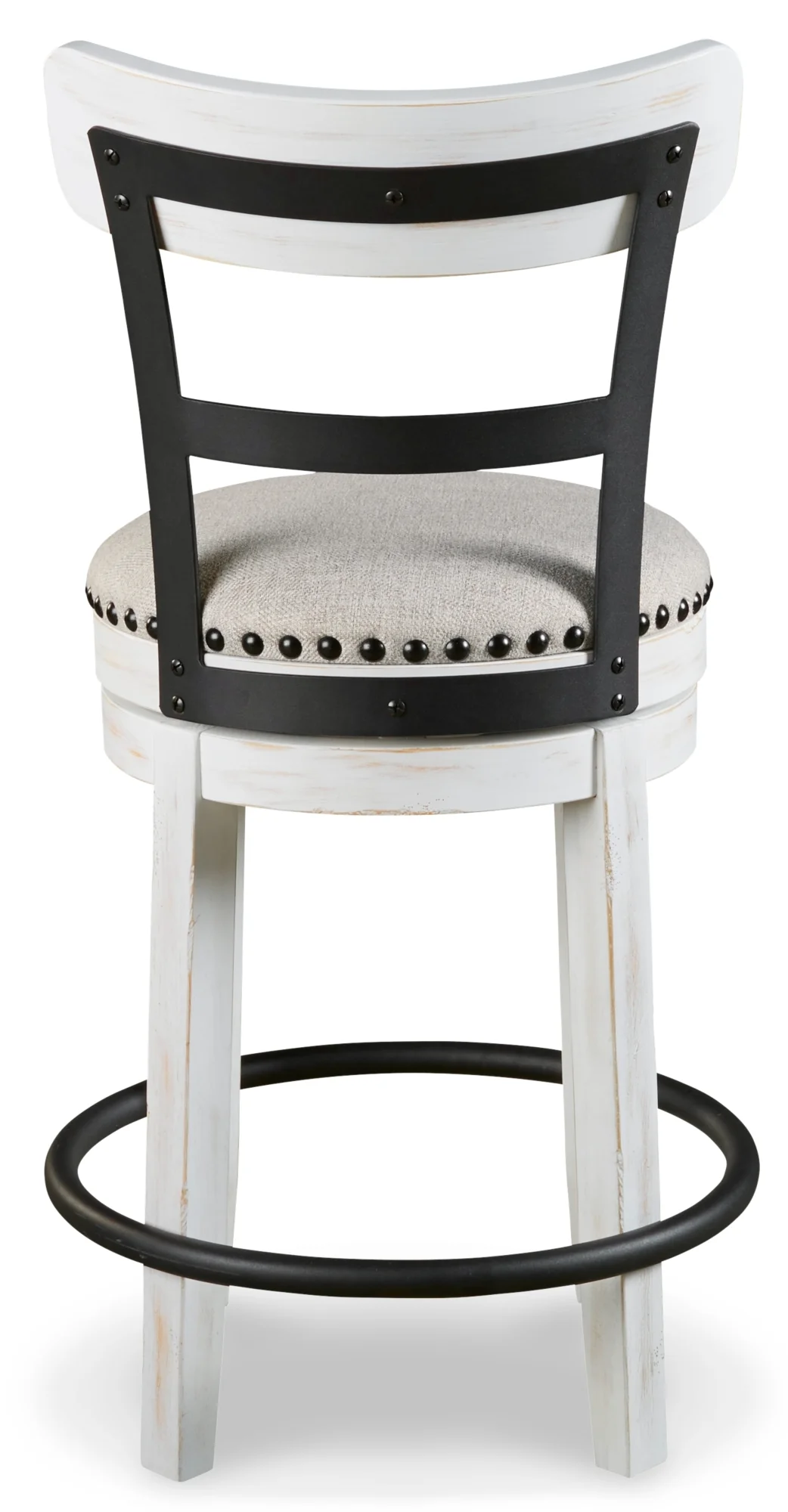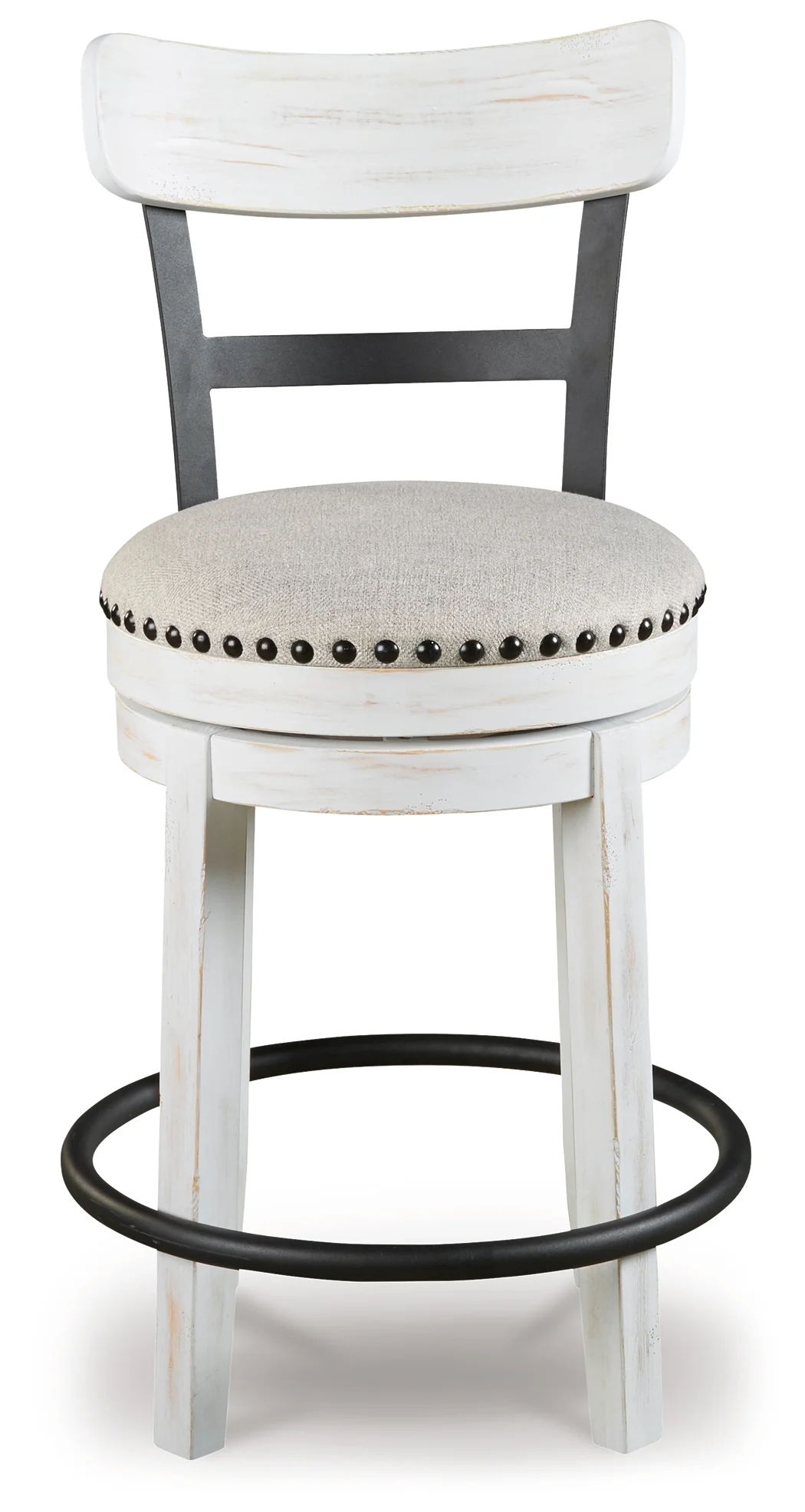 Made with wood, engineered wood and metal, Vintage white finish, Cushioned seat with linen colored polyester upholstery, Smooth 360-degree swivel, Nailhead trim detail, Assembly required