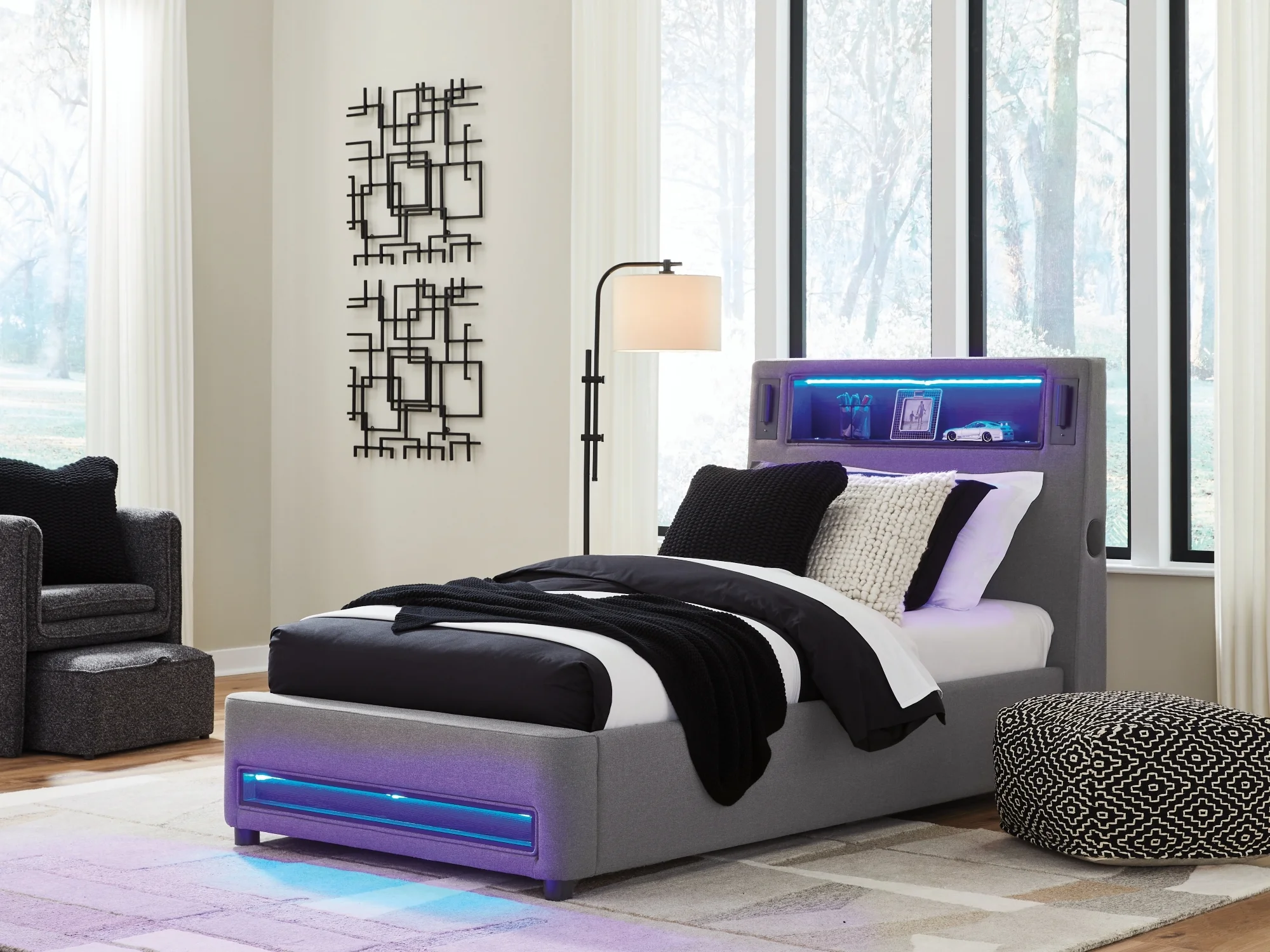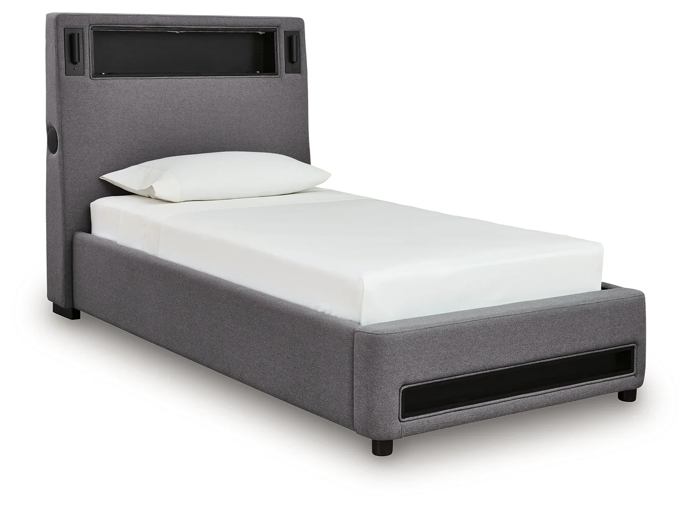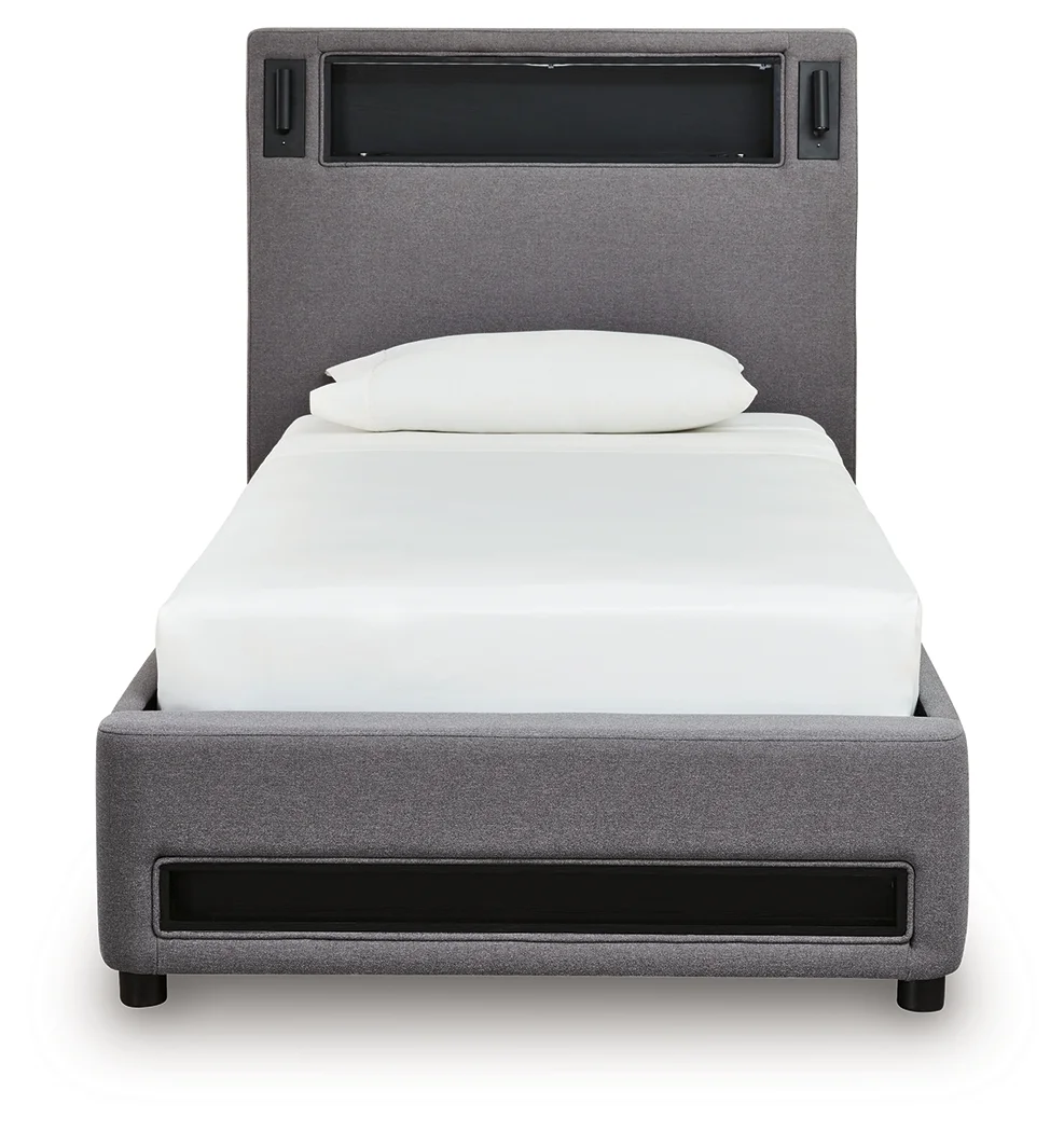 moreSnooze in style with this twin upholstered bed. It brings delightful function to winding down before bedtime, with an adjustable LED reading light on each side. And for added flair, multicolored ambient lighting brings an ultra-cool vibe to the overall look. Combining modern convenience with captivating design, this bed revamps your restful retreat like never before.