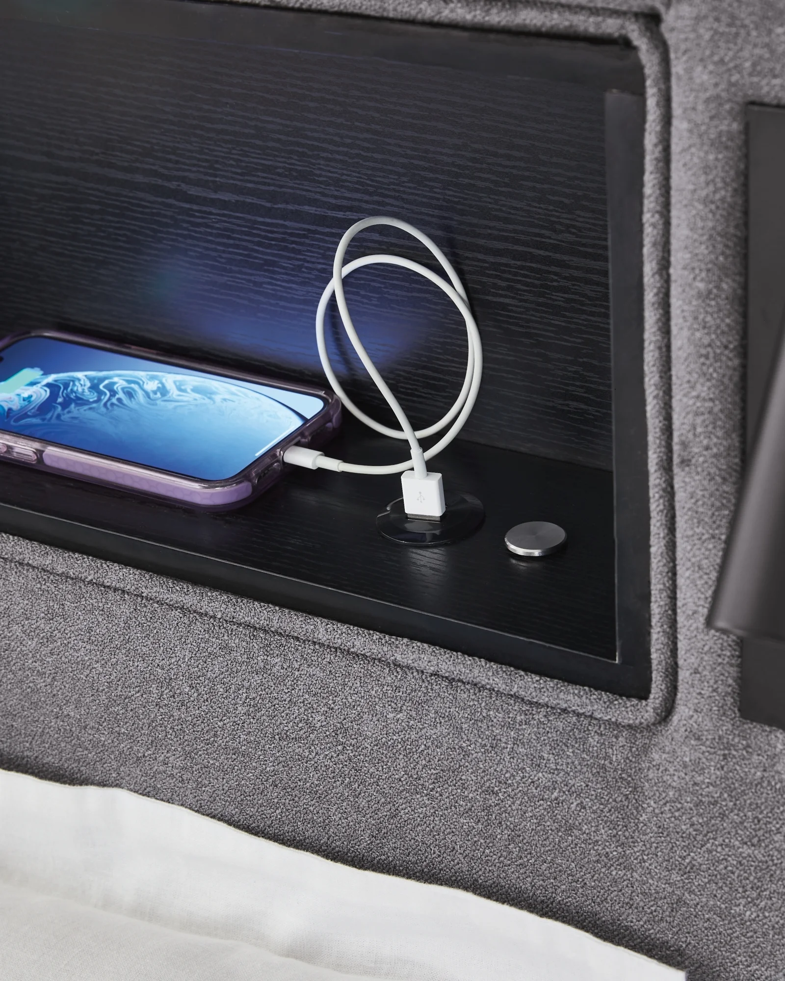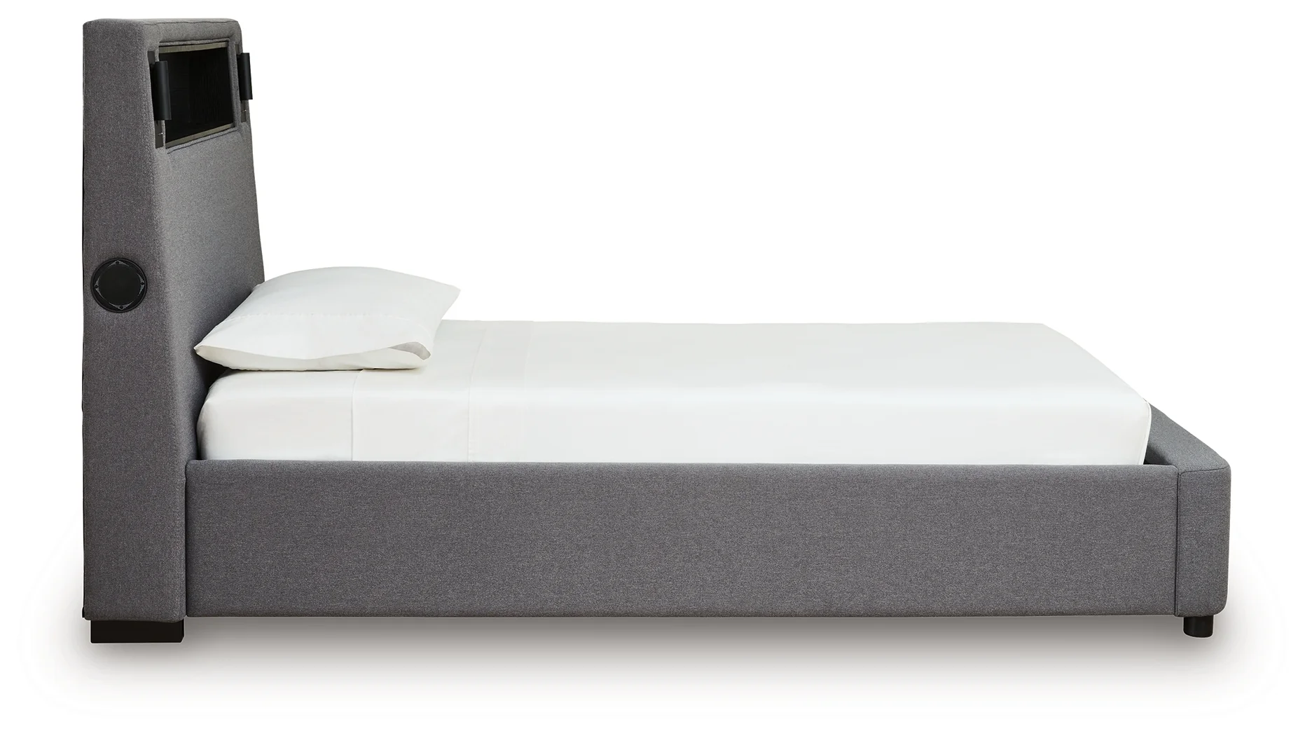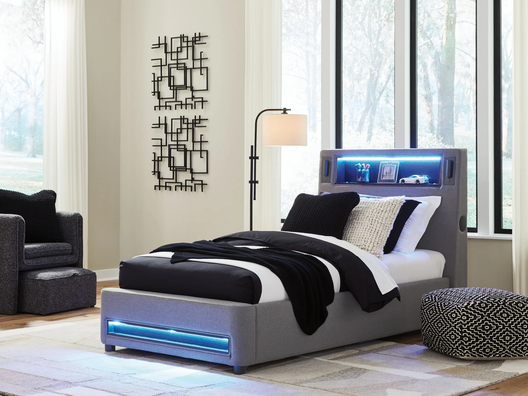 moreSnooze in style with this twin upholstered bed. It brings delightful function to winding down before bedtime, with an adjustable LED reading light on each side. And for added flair, multicolored ambient lighting brings an ultra-cool vibe to the overall look. Combining modern convenience with captivating design, this bed revamps your restful retreat like never before.