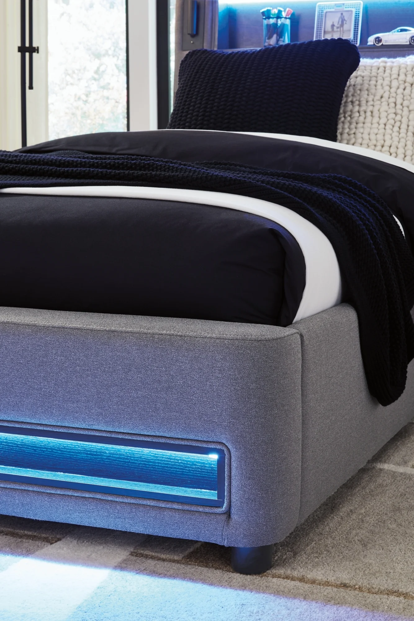 - Multicolored ambient LED lighting in headboard and lower footboard rail
