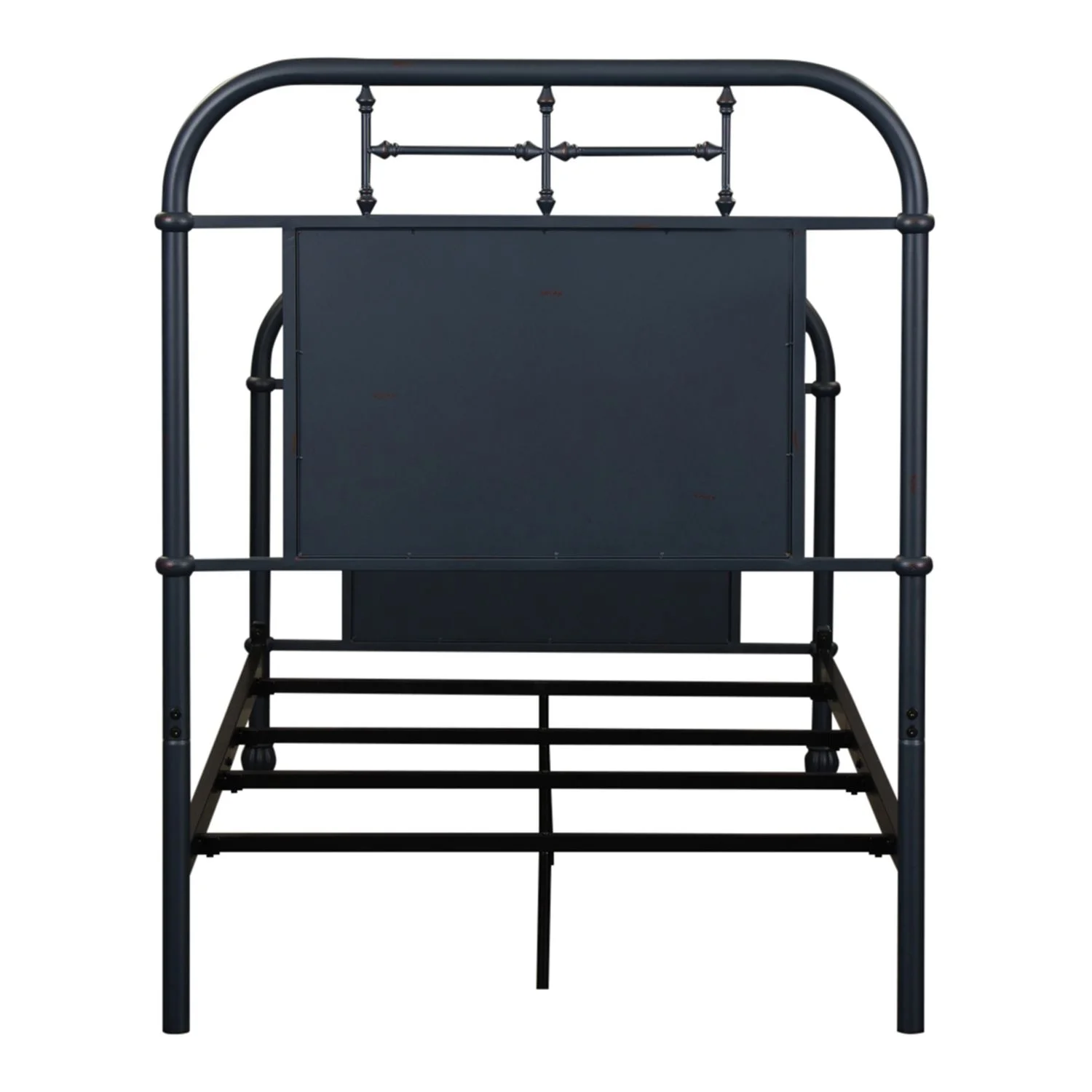 moreAdd a unique look to your home with this twin bed. Crafted of metal tube and finished in a beautiful grey with wear thru. The headboard and footboard feature a softly shaped cap rail and turned metal spindles highlighting a center panel. The metal side rails and bed slats are finished in antique black with wear thru. The essence of the urban living furniture is its unique ability to fit many different styles from rustic, to casual, to contemporary, and this collection does just that.