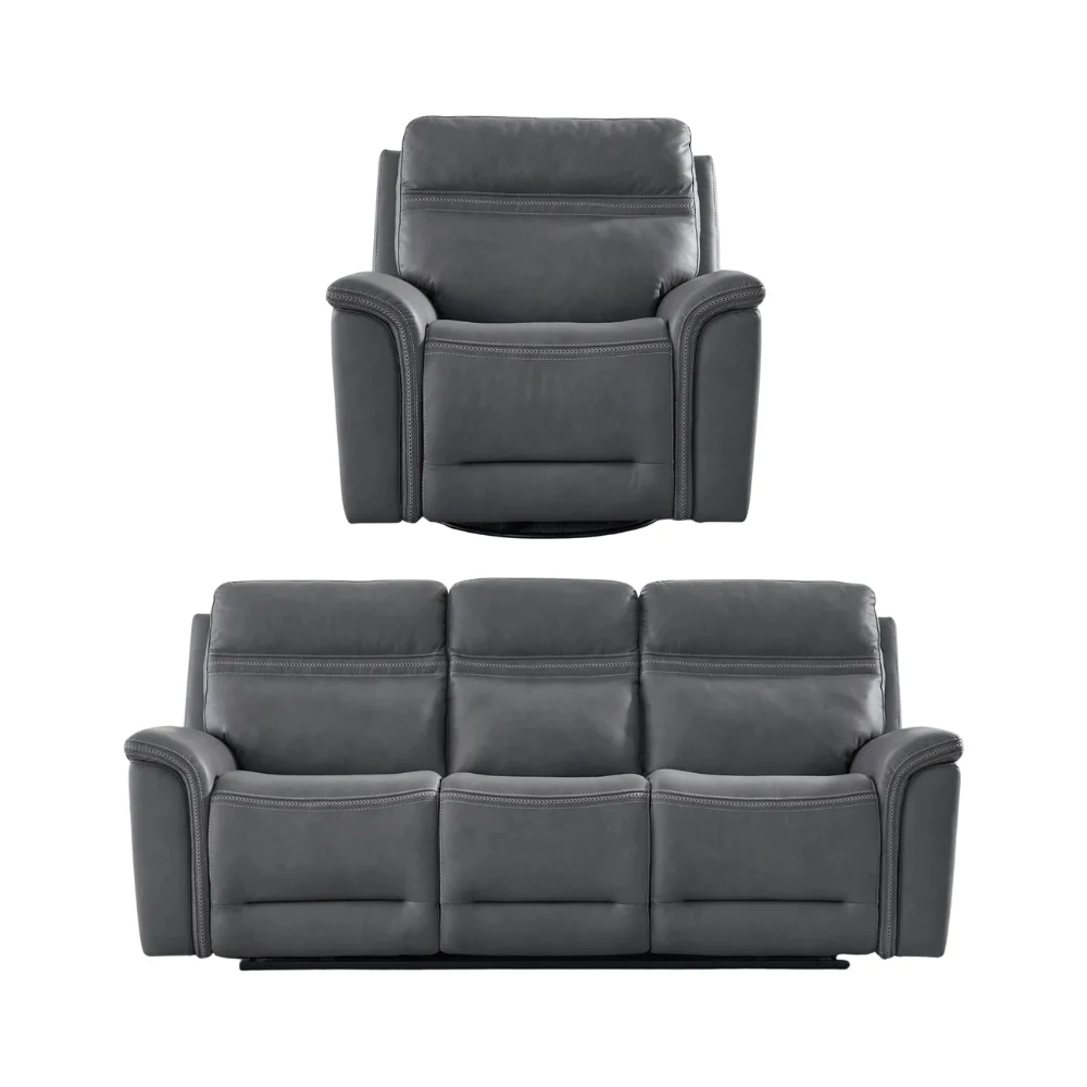 The Cooper sofa and recliner is infused with emotion! Crafted with Solid Hardwood, Plywood and Laminated Veneer Lumber, this set features Semi-Aniline Top Grain Leather with Match in a Bleu Gray Leather finish. PVC Vinyl is matched to the leather and used on the outside backs and sides, meaning everywhere your body touches in real genuine leather! The Cooper sofa and recliner offers triple zero gravity recline with a power articulating headrest and power lumbar support for optimal comfort. The zero gravity reclining mechanism has shown to have immense health benefits including better blood flow and helping those struggling with posture issues. In zero gravity, the neutral spine position can strengthen back muscles, decompress the spine, and reduce tension or discomfort in the neck and shoulders, resulting in enormous benefits on posture. An added layer of memory foam is added to the bucket seats, meaning this sofa and recliner is not only a dream to lounge in, but it is built to last. The full pad-over chaise ensures head-to-toe support. The wax crackle look with full protection, combined with the contrast single and cross stitching gives you the best of both worlds. The high panel back with a decorative trim along with the nested padded arms add for a shapely clean appearance. USB-A and USB-C charging ports are located on each end of the sofa and recliner. The swivel glide recliner base allows you to stay engaged in conversations around the room, without having to strain your neck or leave your seat. A built-in stop mechanism is used to protect the wiring during swivel. Relax in livable luxury with the Cooper sofa and recliner set.