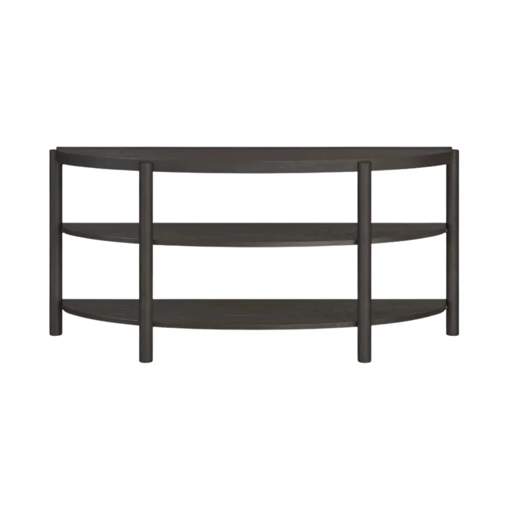 Maximize your storage and style with the Dale Sofa Table! Its sweeping, semi-circular silhouette is dressed in a warm, smooth Oak Veneer and built with robust Hardwood Solids. Need more room to showcase your latest read and family vacation photos? You'll triple your decorating and storage options as the three-tiered, sturdy shelving puts your favorite items in the spotlight.