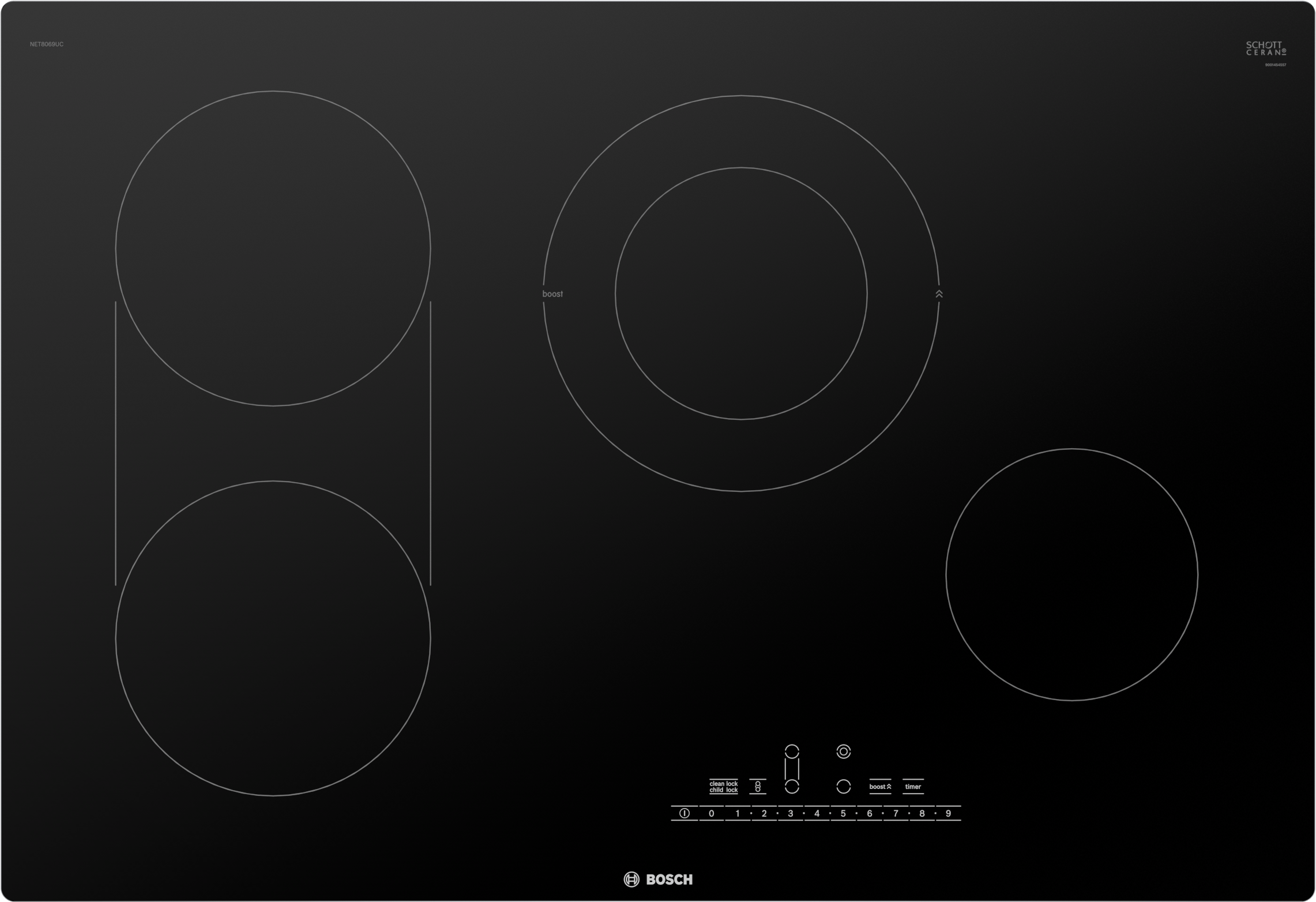 4 cooktop elements - Delivers 1200-3600 watts of power for versatile heating options., Bridge option - Bridge option combines 2 elements to accommodate long pans and many diameters of cookware, Smooth ceramic cooktop - Sleek ceramic glass surface is modern and cleans easily with a simple wipe, SpeedBoost® - SpeedBoost® feature adds a boost of cooking power to the cooktop element, so you can boil a pot of water faster, and heat a pan up more quickly, 6 or 9 inch element - Dual-size element provides a flexible cooking area to accommodate pans of different sizes., PreciseSelect Touch Controls - PreciseSelect offers 17 different cooking level settings with an easy to use touch control panel, Frameless design - The frameless design is sleek and modern, integrating into a range of kitchen styles, Dual elements offer the capability to use multiple pan sizes, Cooktop design coordinates with Bosch ovens and ventilation
