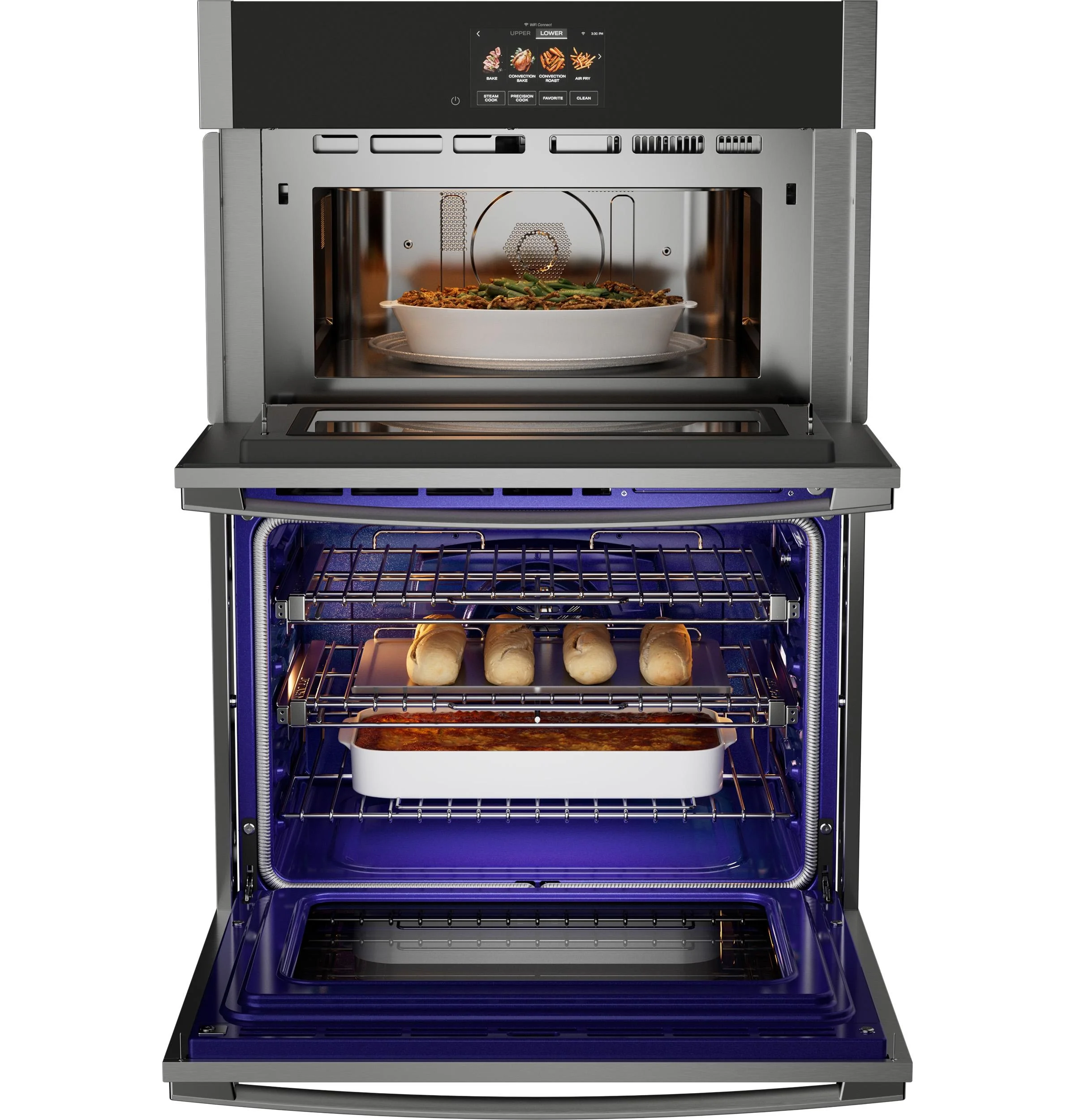 Speedcook oven 120v (upper oven), True European Convection (lower oven), Brilliant 7" LCD Display, No Preheat Air Fry, Steam Bake Mode, Steam Sous Vide Mode, 28 pre-programmed menu selections, 8-pass bake element (lower oven), 8-pass broil element (lower oven), Self-clean with Steam Clean option (lower oven)