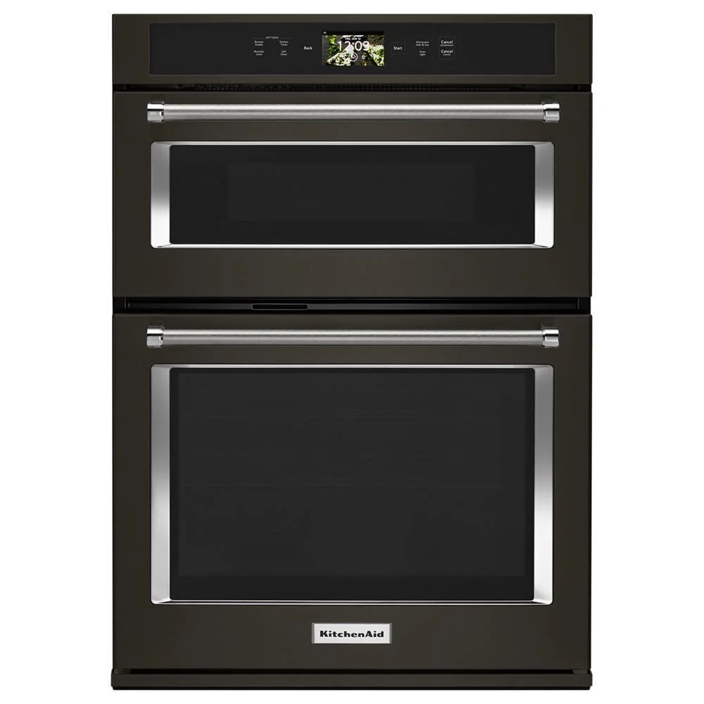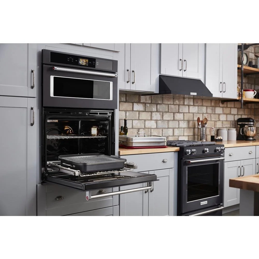 Open up new culinary possibilities. KitchenAid introduces the first combination wall oven that comes with interchangeable attachments in the tradition of the iconic KitchenAid® Stand Mixer to enable grilling, stone cooking and steaming. It supports a full complement of smart capabilities as well as baking, broiling and Even-Heat™ True Convection, and maintains its own beauty with a fingerprint-resistant PrintShield™ finish.