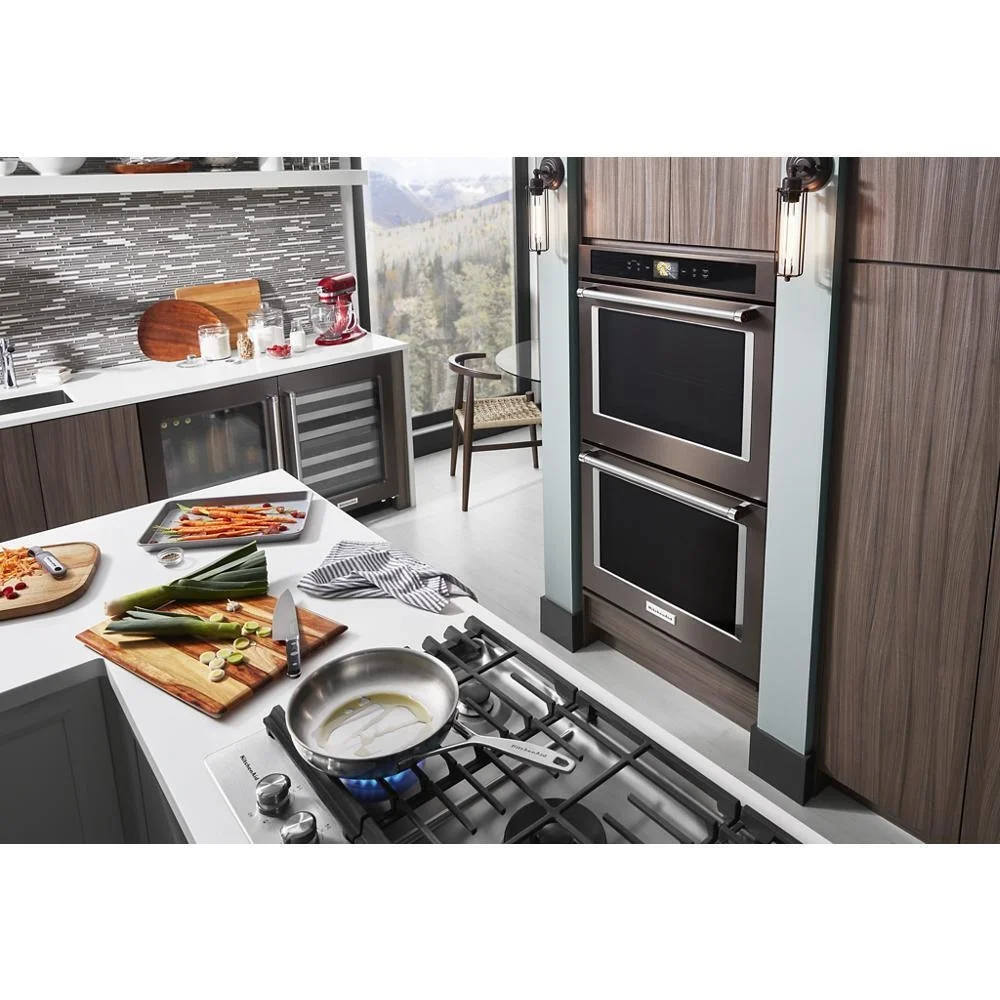 Open up new culinary possibilities. KitchenAid introduces the first double wall oven that comes with interchangeable attachments in the tradition of the iconic KitchenAid® Stand Mixer to enable grilling, stone cooking and steaming. It supports a full complement of smart capabilities as well as baking, broiling and Even-Heat™ True Convection, and maintains its own beauty with a fingerprint-resistant PrintShield™ finish.