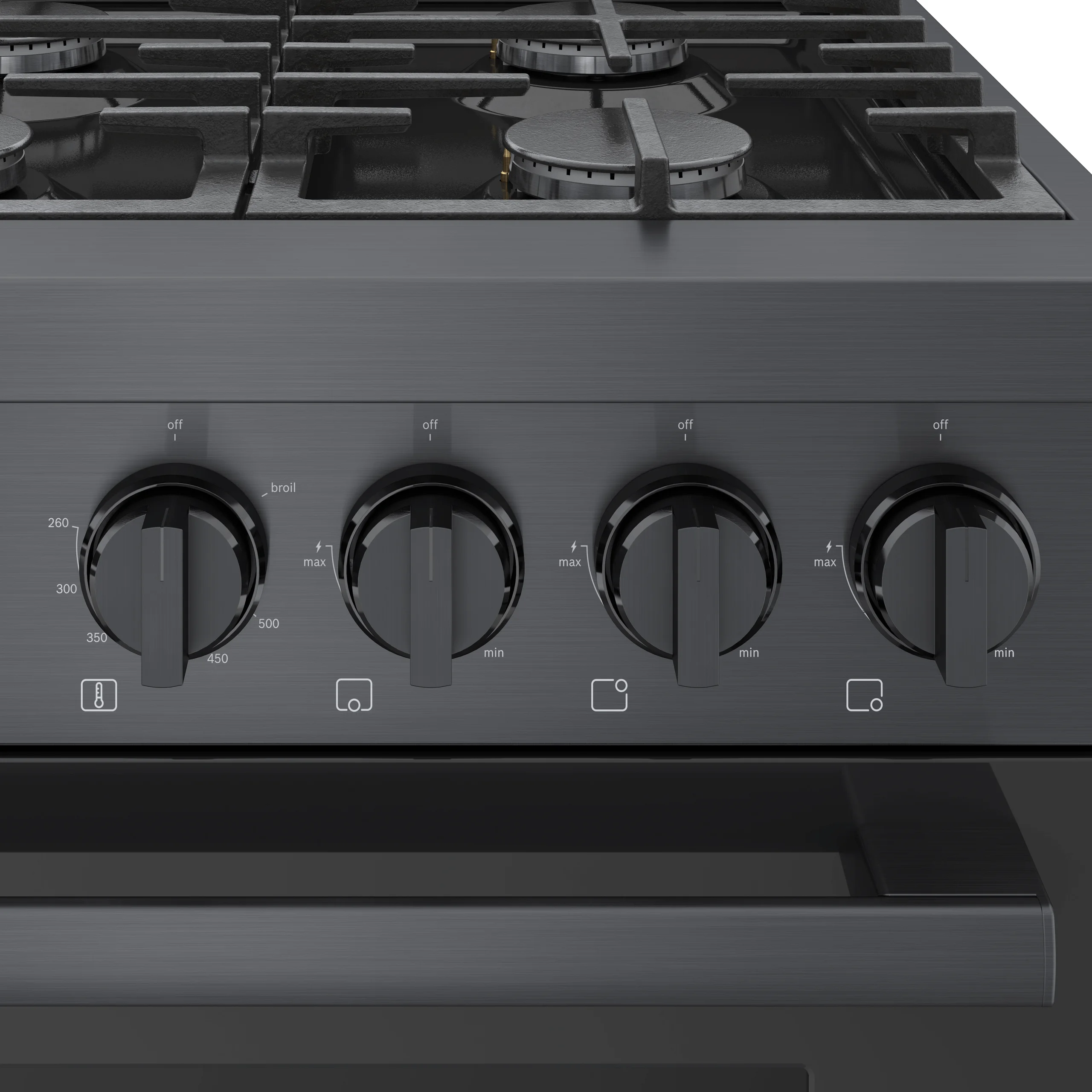 Telescopic Rack: - moves smoothly and supports heavy dishes and casserole pans with ease, QuietClose® Door: - dampened hinges softly guide the door shut for a more peaceful kitchen, Industrial-Chic Design: - features heavy duty metal knobs and a bold design, along with high-performing function., Continuous Cast Iron Grates: - allows you to easily slide heavy pots and pans from burner to burner., 18,000 BTU Center Burner: - powerful burner delivers quickly for searing, boiling and more, QuietClose® Door: - dampened hinges softly guide the door shut for a more peaceful kitchen, Industrial-Chic Design: - features heavy duty metal knobs and a bold design, along with high-performing function., Continuous Cast Iron Grates: - allows you to easily slide heavy pots and pans from burner to burner.