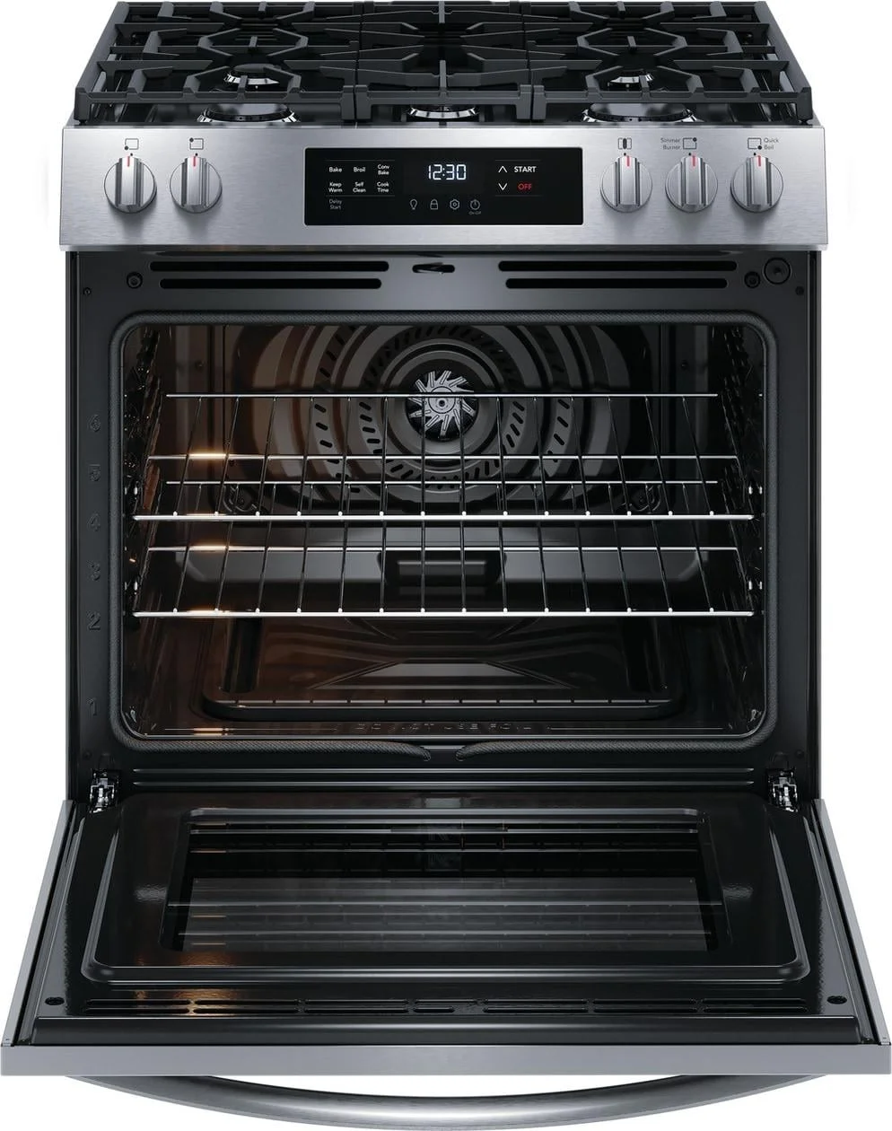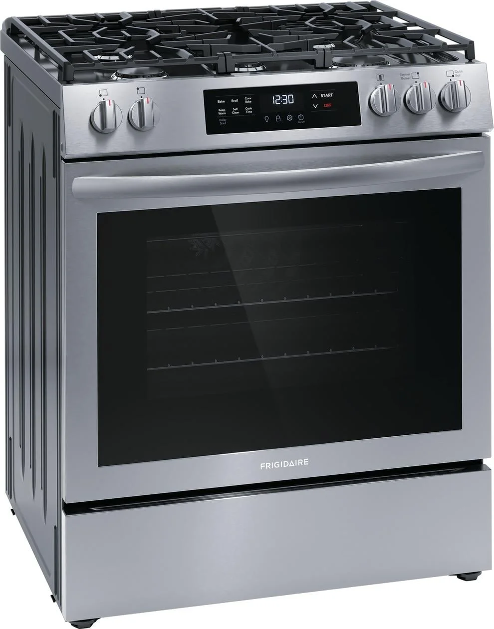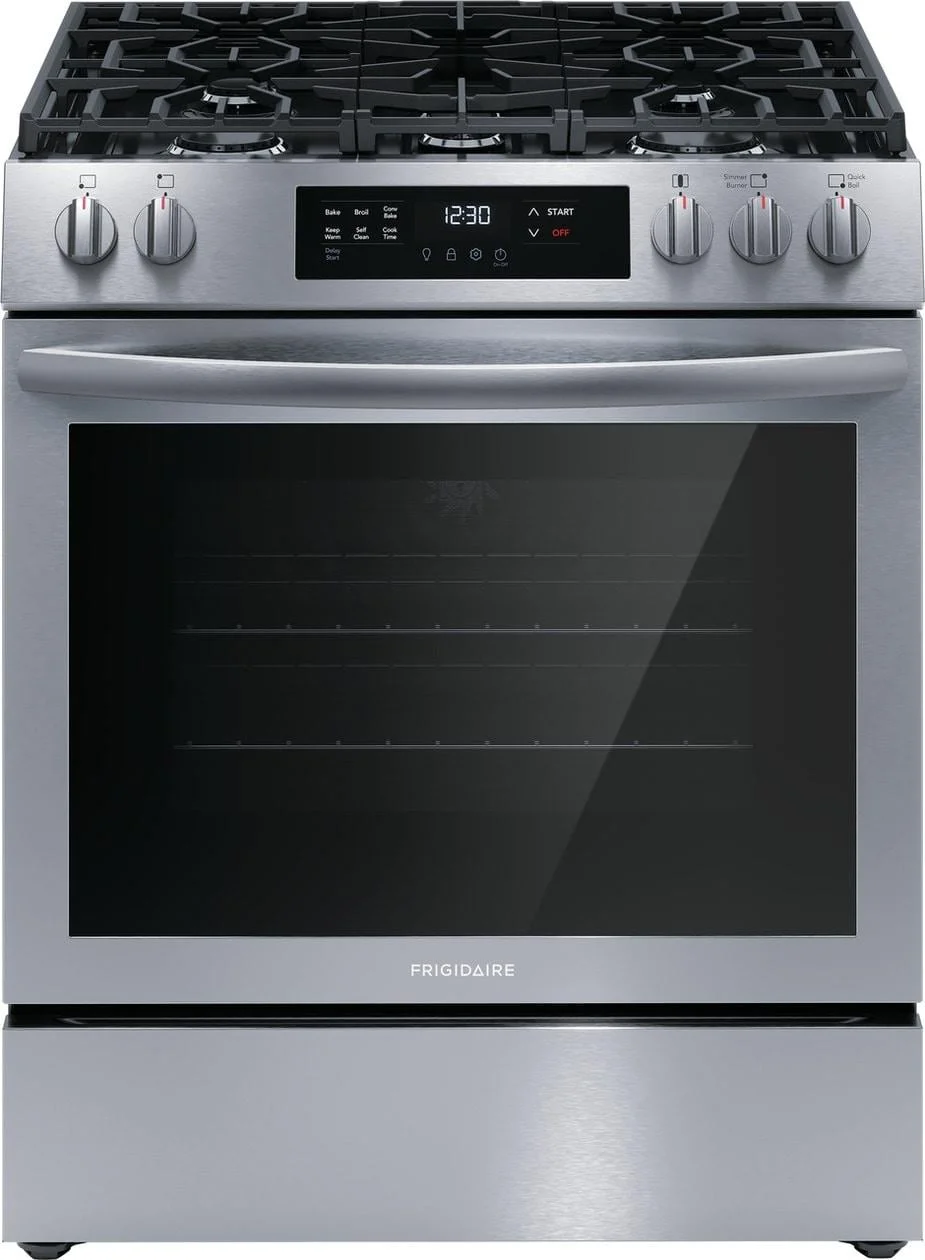 The Frigidaire 30" Front Control Freestanding Gas Range with Convection Bake delivers faster, more even baking results. In addition to faster baking, you can experience faster boil times and more powerful cooking with the 18,000 BTU Quick Boil burner. Plus, features a flexible five burner cooktop was designed to fit all your cooking needs. Also features a convenient 3 hour self-clean cycle, making it easier to keep your oven clean.