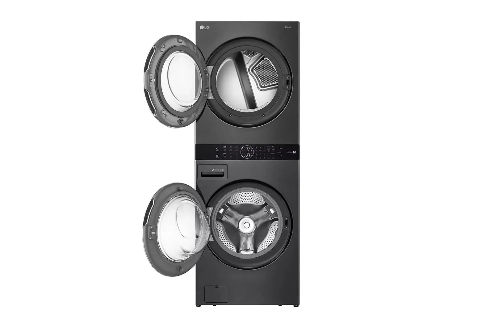 Ultra Large Capacity 4.5 cu.ft. Washer and 7.4 cu.ft. Dryer let you clean larger loads, Single Unit Vertical Design takes up half the floor space, Our Sleekest Center Control Yet -LED display makes it easier to reach the controls, Built-in intelligence takes out the guesswork-AI technology selects optimal wash & dry settings, Advanced washing and drying performance with TurboWash 360°, Allergiene Wash Cycle & TurboSteam, Get the ThinQ app to access smart functions and ThinQ Care alerts, Premium looks with real tempered glass doors designed to last
