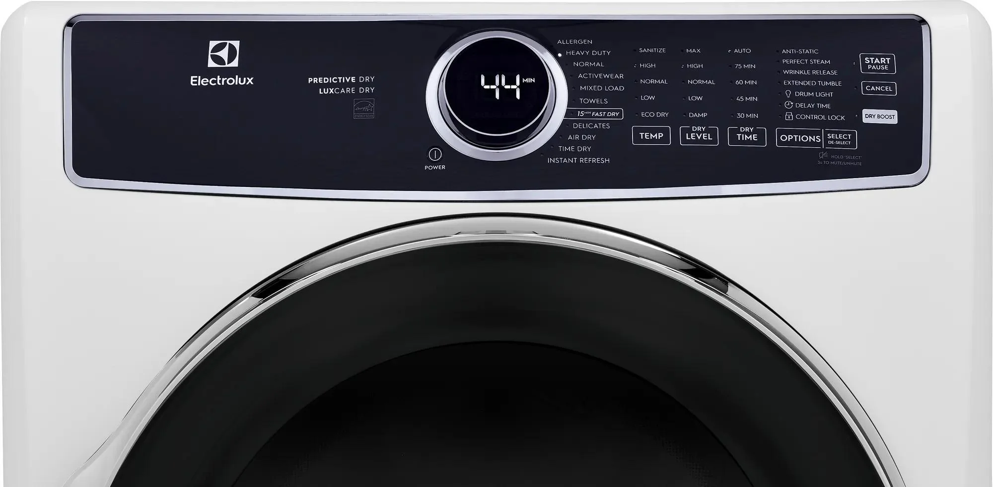 Introducing the Electrolux PerfectSteam Gas Dryer with Balanced Dry ™ and Instant Refresh. Removes wrinkles and quickly refreshes items with steam in 10 minutes. Front loading. Just like every dryer, but this one matches front load washers. LuxCare dry provides an advanced sensor to keep your clothes from over or under drying. 15 minute fast dry is exactly what it sounds like- drying in 15 minutes when you really need an item or two. Balanced Dry™ adds a layer of cool protection against harsh temperature spikes. Lint filter keeps that junk off your clothes. Extended tumble keeps clothes tangle free without heat when you’re too lazy, er preoccupied, to unload it. Giant 8.0 cu ft capacity means more room for air to circulate around large loads and dry faster. LED lighting illuminates controls and the drum. Instantly convenient and nothing crappy.