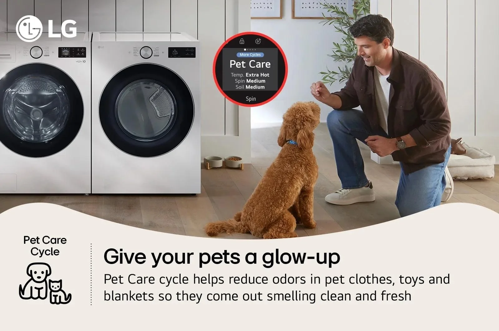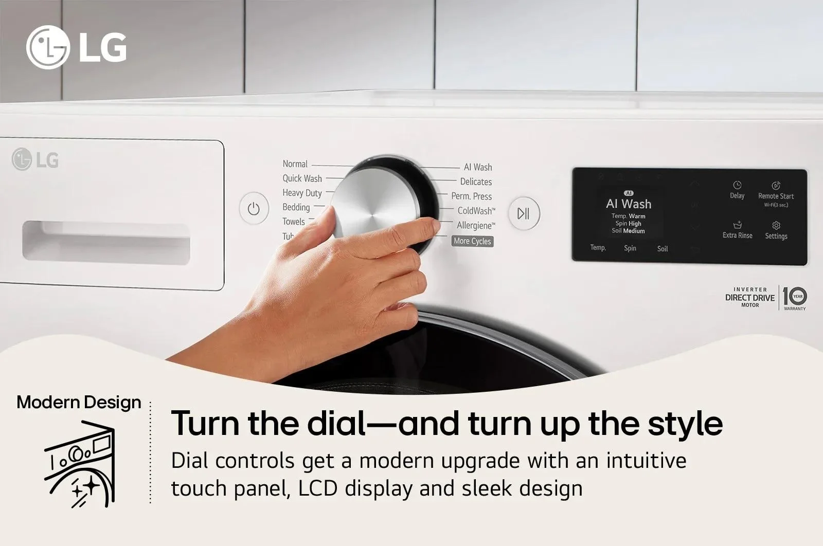 5.0 cu. ft. Mega Capacity lets you fit more in every load, Built-in intelligence takes out the guesswork-AI technology selects optimal wash settings, With TurboWash® 360° Technology, power clean big loads in under 30 minutes, Allergiene® Cycle uses the gentle power of steam to reduce allergens, Pet Care Cycle helps reduce odors in pet clothes, toys and blankets so they come out smelling fresh, Dial controls get a modern upgrade with an intuitive touch panel, LCD display and sleek design, Get the ThinQ® app to access smart functions, ThinQ Care™ alerts and download new ThinQ UP™ features