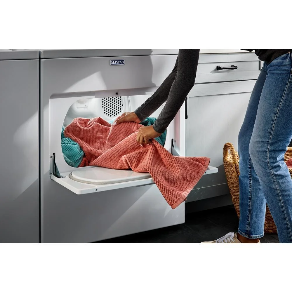 Wrinkles are no match for this Maytag® top load gas dryer with the automatic Wrinkle Prevent phase that keeps clothes tumbling to help block wrinkles. The spacious 7.0 cu. ft. capacity can handle large loads, and the hamper door drops down to give you a chute for loading and a sturdy platform for unloading, folding and stacking. Plus, count on Maytag Brand with the included 10-year limited parts warranty on the motor and dryer drum.* *See product warranty for details