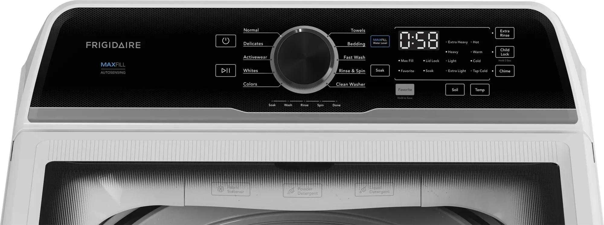 This Frigidaire top load washer has a large capacity that can fit up to 25 towels with 10 wash cycles to meet any washing need. It maximizes cleaning performance with an improved agitator that prevents clothing from tangling and the MaxFill™ option that adds water to improve cleaning performance depending on the selected cycle. It offers conveniences like a quick wash cycle, personalized cycle selection, and a detergent drawer with dedicated compartments for additives.