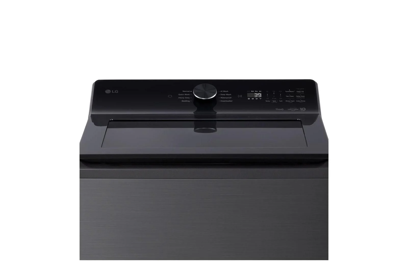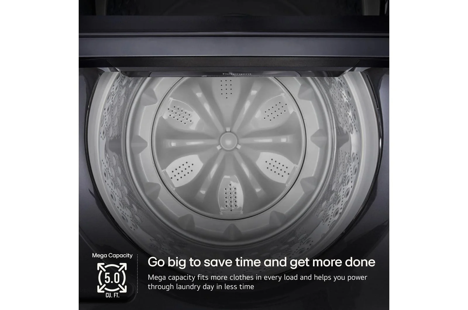 Enjoy a 2-year limited warranty on select appliances purchased through December 31, 2025 via the ThinQ® app. Terms apply., 5.0 cu.ft. Mega Capacity lets you fit more in every load, EasyUnload™ design offers a more comfortable, ergonomic reach without sacrificing capacity, Built-in intelligence takes out the guesswork-AI technology selects optimal wash settings, Top load washer, completely reimagined- Electronic Controls with LED Display & SlamProof™ Glass Lid, Get the ThinQ® app to access smart functions, ThinQ Care™ alerts and download new ThinQ UP™ features, TurboWash® Technology -powerful yet gentle clean