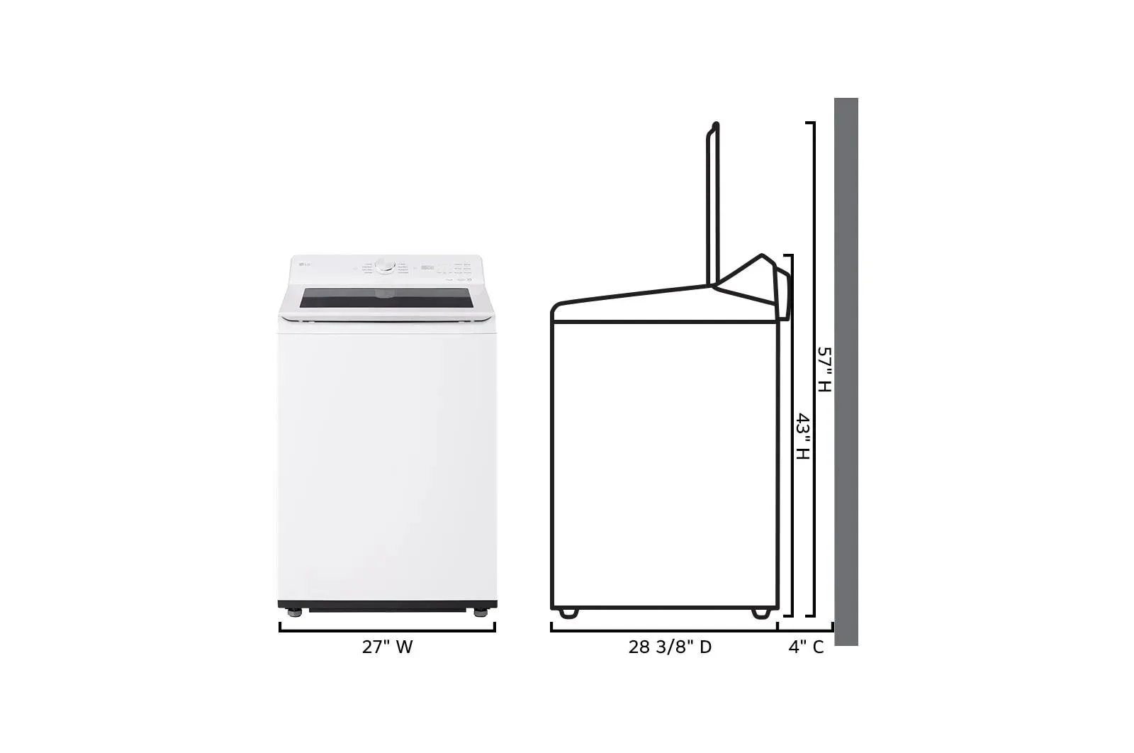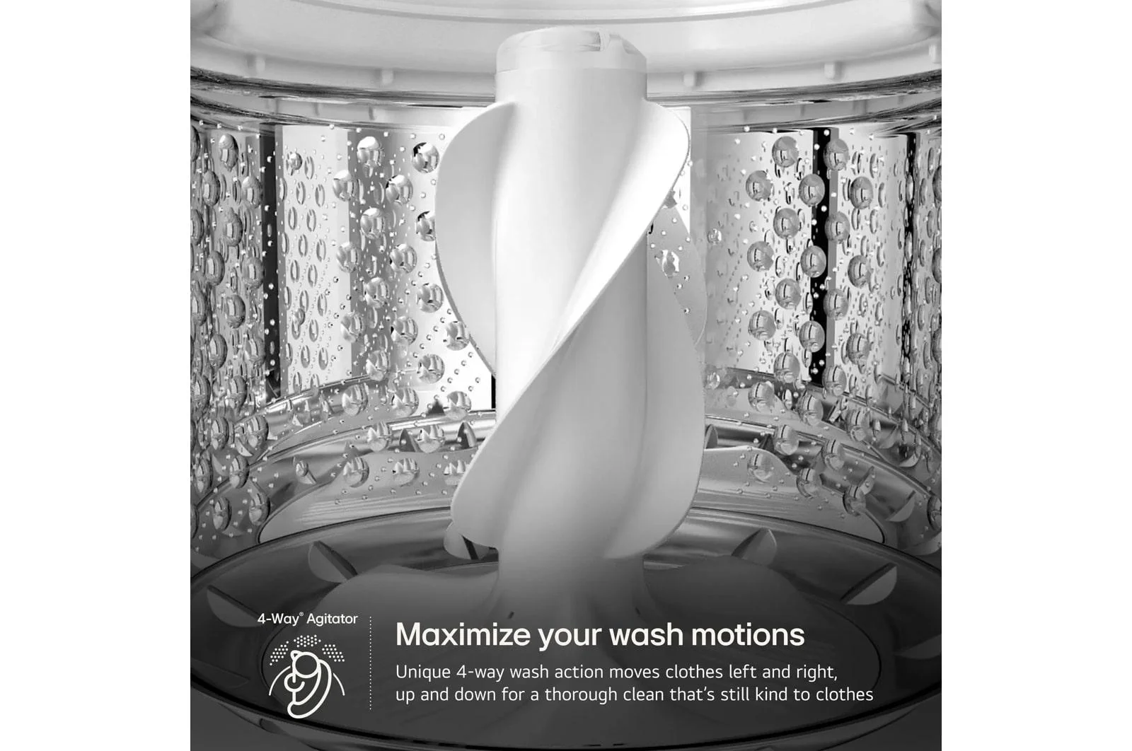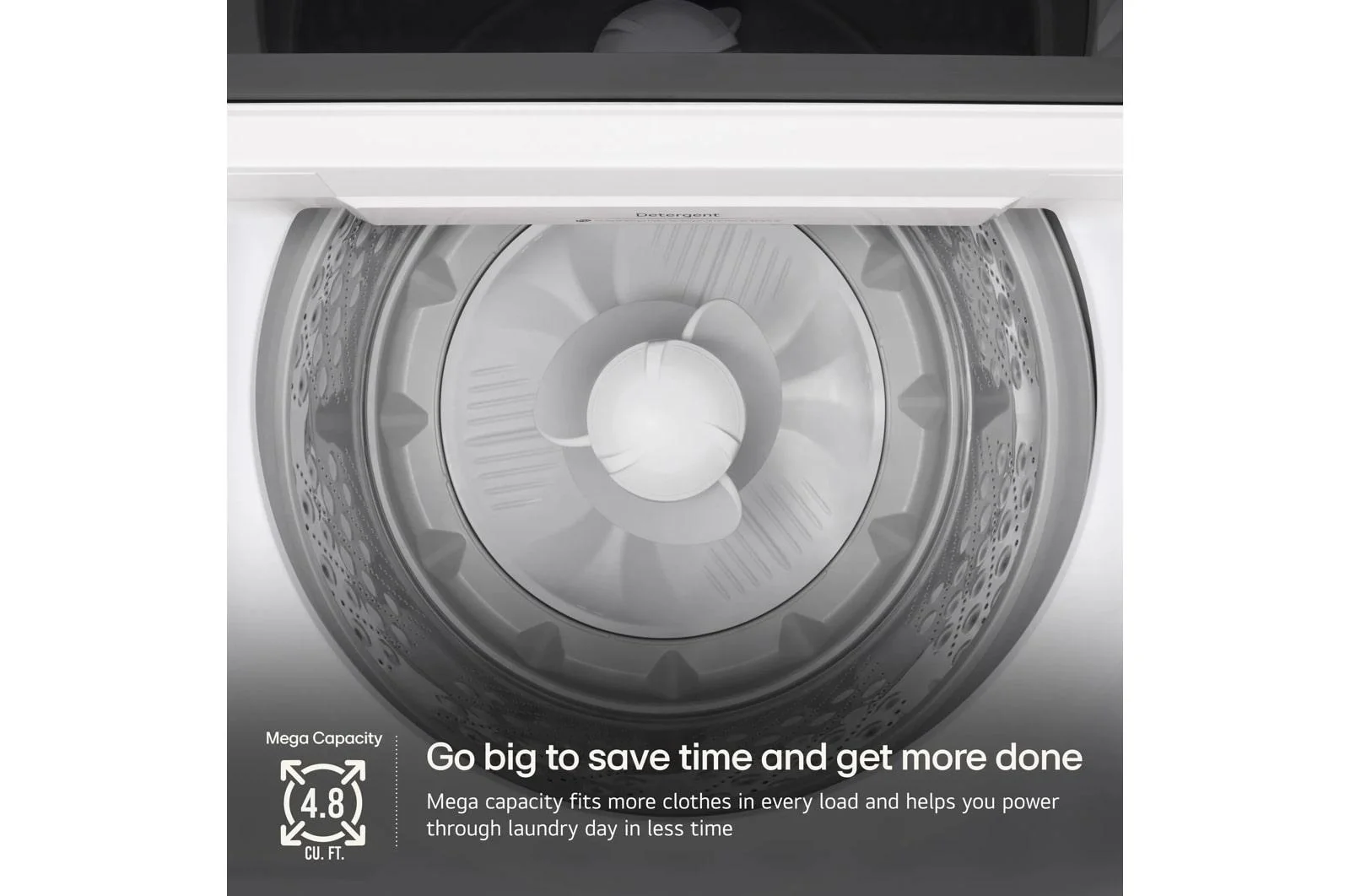 Enjoy a 2-year limited warranty on select appliances purchased through December 31, 2025 via the ThinQ® app. Terms apply., 4.8 cu.ft. Mega Capacity lets you fit more in every load, EasyUnload™ design offers a more comfortable, ergonomic reach without sacrificing capacity, Built-in intelligence takes out the guesswork-AI technology selects optimal wash settings, 4-Way® Agitator gives a gentle yet thorough clean with its unique wash action, Top load washer, completely reimagined- Electronic Controls with LED Display & SlamProof™ Glass Lid, Get the ThinQ® app to access smart functions, ThinQ Care™ alerts and download new ThinQ UP™ features, TurboWash® Technology -powerful yet gentle clean