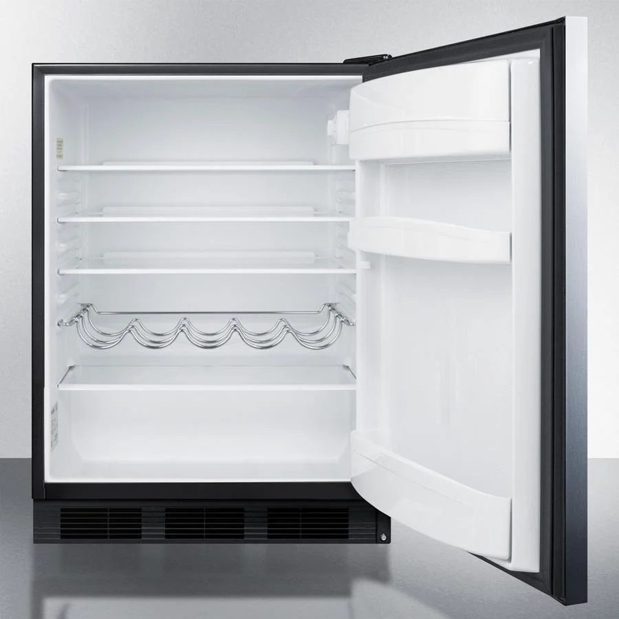 SUMMIT offers the industry s largest selection of ADA compliant built-in undercounter refrigeration, with a range of choices to best meet the needs of any home or facility with height limitations. Sized with a 24 footprint and 32 height, the AR5BS is an all-refrigerator with a front-breathing system that allows built-in installation under lower ADA compliant counters. The fully finished cabinet also enables freestanding use. This model comes with a black cabinet finish and reversible stainless steel wrapped door. It includes a pre-installed stainless steel handle in a sleek 14mm diameter mounted horizontally across the top of the door. Inside, the AR5BS utilizes automatic defrost operation to ensure minimum user maintenance. The 5.5 cu.ft. interior offers more storage space than most models in this size class. Adjustable glass shelves ensure spill-proof storage, with a removable scalloped wine shelf ideal for keeping bottles in place. The door includes three storage racks for condiments and tall bottles. The white interior offers easy visibility, with an automatic light included. The AR5BS features Summit's intuitive dial thermostat for easy temperature management. Designed and constructed in Europe, the AR5BS brings reliable cold storage to any setting in need of a quality refrigerator in an ADA compliant height. For a panel-ready version of this unit, see the AR5IF.