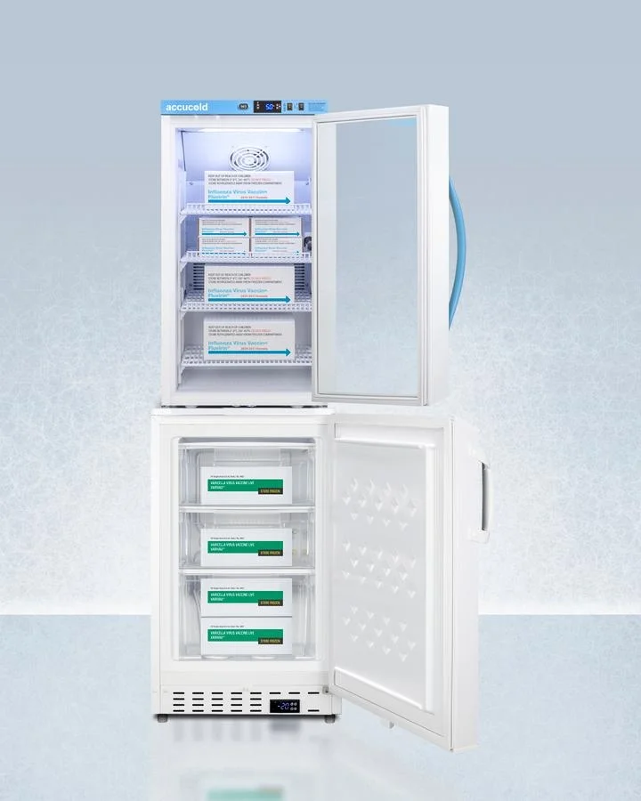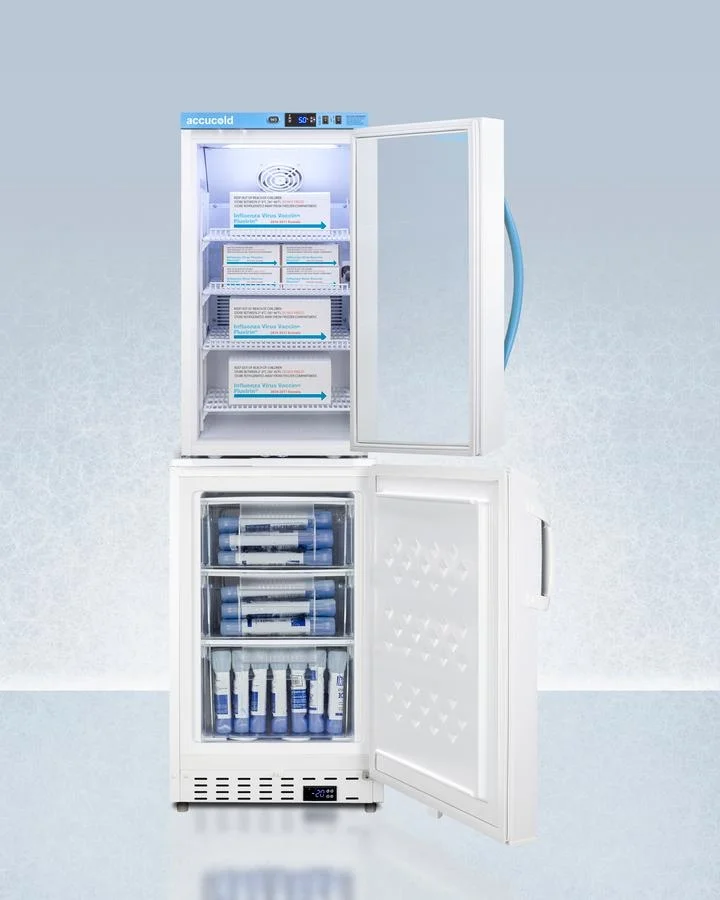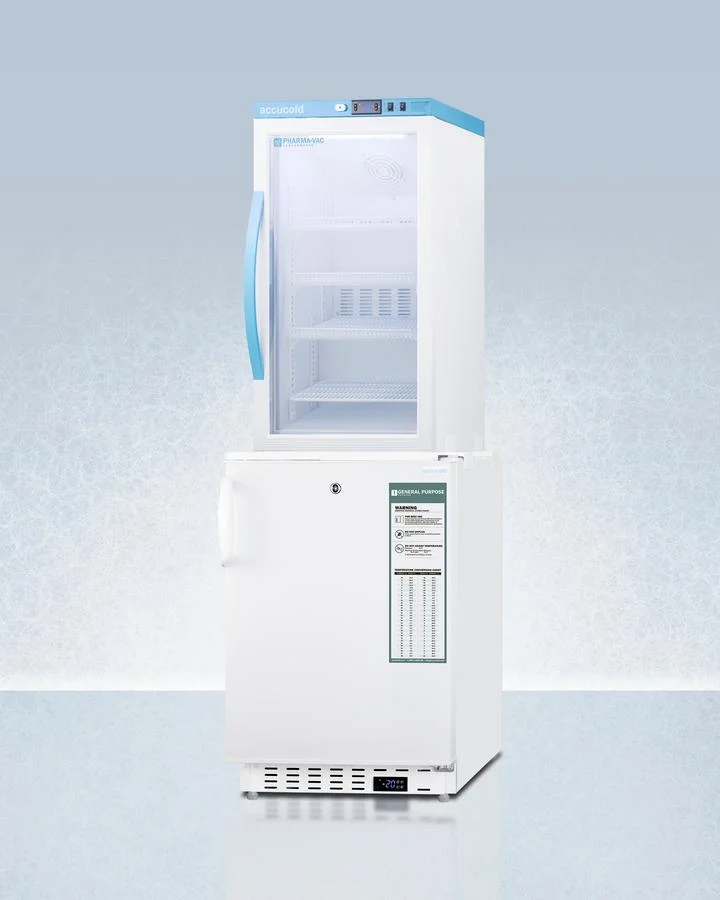 Accucold offers innovative solutions to vaccine storage with stackable purpose-built refrigerator-freezer combinations design to support meeting CDC/VFC/VFA guidelines. Sized at just 20" wide, the ARG3PV-ADA305AFSTACK combines the 3 cu. ft. ARG3PV auto defrost vaccine refrigerator with ADA305AF 2.47 cu. ft. manual defrost vaccine freezer into one slim footprint using Accucold's StackRack. This ships in three boxes and requires some minor assembly upon delivery. Refrigerator ARG3PV is part of Accucold's Pharma-Vac Performance Series, designed to meet the demanding needs of vaccine storage. It utilizes a microprocessor temperature controller with an adjustable control range from +2 to +8 C. The buffered temperature probe is encased in a glycol-filled bottle to better simulate temperature of the stored product, with an additional sensor that reads air temperature to ensure superior temperature control. The current and min/max temperature display is viewable in Celsius or Fahrenheit to the nearest tenth of a degree. The audible and visual temperature alarm sounds if the unit's interior goes out of range. Additional alarms include a power failure alert, door open alarm, and sensor failure alarm. This unit is equipped with remote alarm contacts in the rear and a 1/2" probe port on the right side to accept additional monitoring devices. The factory-installed antimicrobial handle is powder-coated with naturally occurring silver ions, which help to reduce the spread of germs, allowing for a safer, cleaner user experience. Inside, the ARG3PV utilizes adjustable cycle defrost operation to avoid temperature spikes. Optimized forced air cooling with an internal fan ensures excellent temperature stability and uniformity with rapid recovery after door openings. The adjustable plastic-coated wire shelves can be positioned at 1/2" increments to accommodate virtually any sized item. This unit includes LED internal lighting with an on/off rocker switch. The interior is constructed from white powder coated metal to ensure added durability and better temperature retention. The refrigerator is designed to be stacked on top of the ADA305AF, a -25 C vaccine freezer that utilizes manual defrost operation. The freezer has 3" thick door for efficient insulation, and a flat door liner, as recommended by the CDC, to ensure users don't store sensitive materials on the door. Three removable pull-out drawers on fixed wire shelving offer convenient storage, with plastic fronts that help to protect contents from warmer ambient temperatures when the door is opened. A digital thermostat, located in the kickplate, makes for easy temperature management with a readout in Fahrenheit or Celsius. This unit is also equipped with high/low temperature and open door alarms, as well as an access port to accept additional monitoring equipment. Both units include front-mounted keyed locks, powerful magnetic gaskets to ensure a positive seal, and hospital grade cords with 'green dot' plugs for added safety in high traffic areas. The refrigerator has a self-closing door. Additional stacked combinations are available. Browse Accucold's website for more information, or contact our sales team at 718-893-3900 to discuss your equipment needs. NOTE: Accucold refrigerators are purpose-built to the support meeting the current CDC (Centers for Disease Control) guidelines for the storage of vaccines. At this time, Accucold refrigerators have not been evaluated to the new NSF 456 standard. As referenced in the current Vaccine Storage and Handling Toolkit, these units incorporate microprocessor controls and forced air circulation for stable operation between 2 and 8 C. For additional temperature assurance, the CDC recommends a calibrated digital data logger (DDL), which can be added with the factory-installed option DL2B or addition of the DL2BKit accessory.