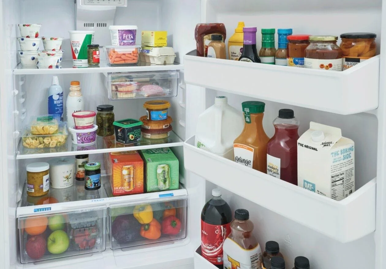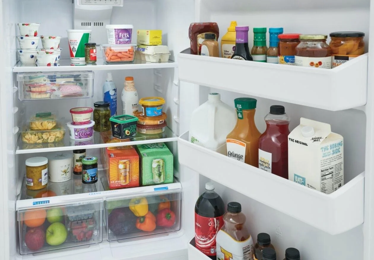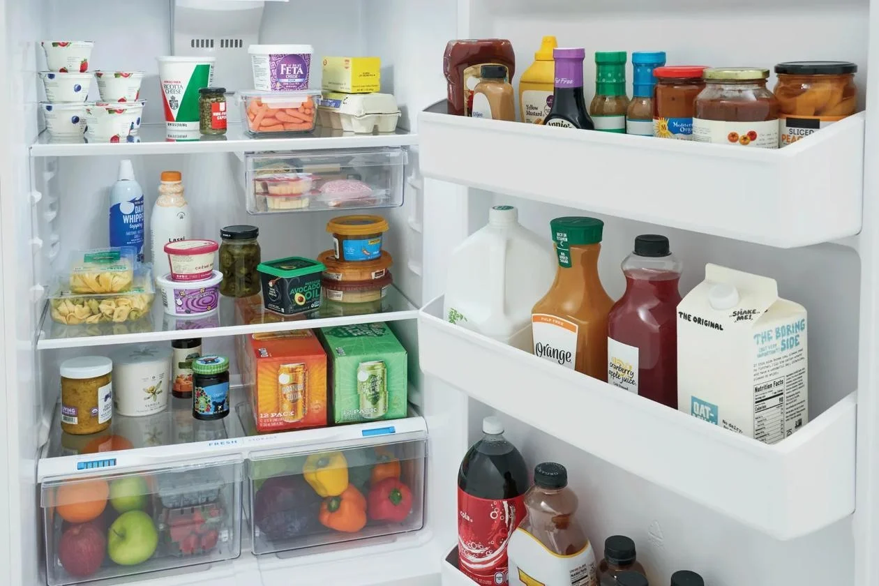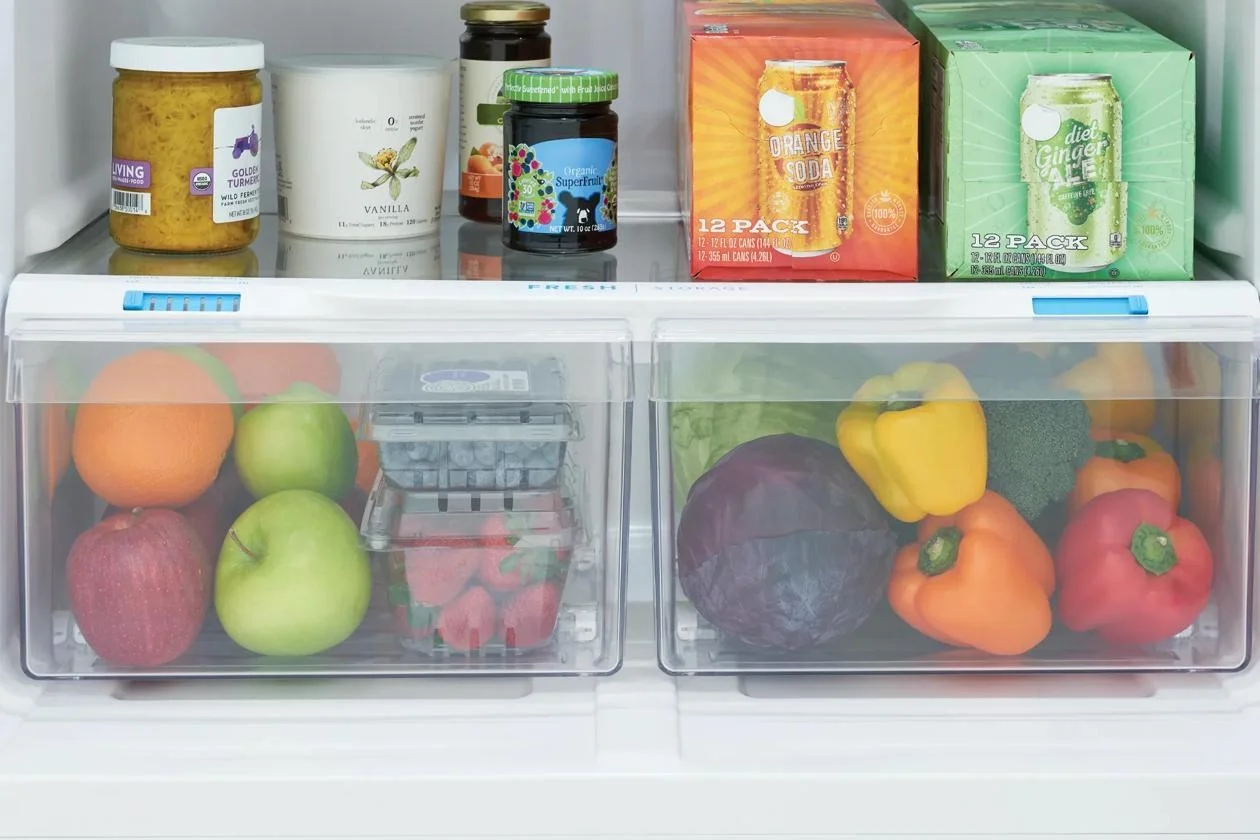 This Frigidaire 18 cu. ft. top freezer refrigerator includes spacious interior storage options designed for busy families, including generous door bins, adjustable full-width glass shelving, and a sliding deli drawer. Our humidity-controlled crispers keep produce fresh for longer, allowing you to waste less and save money.
