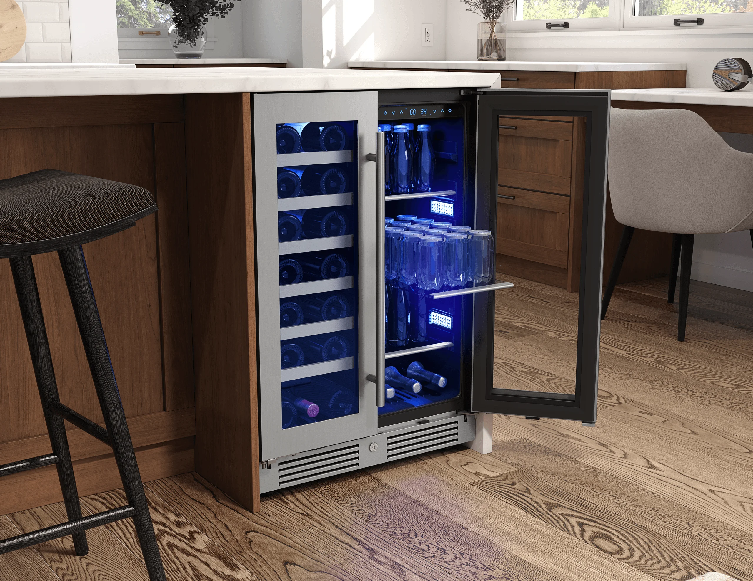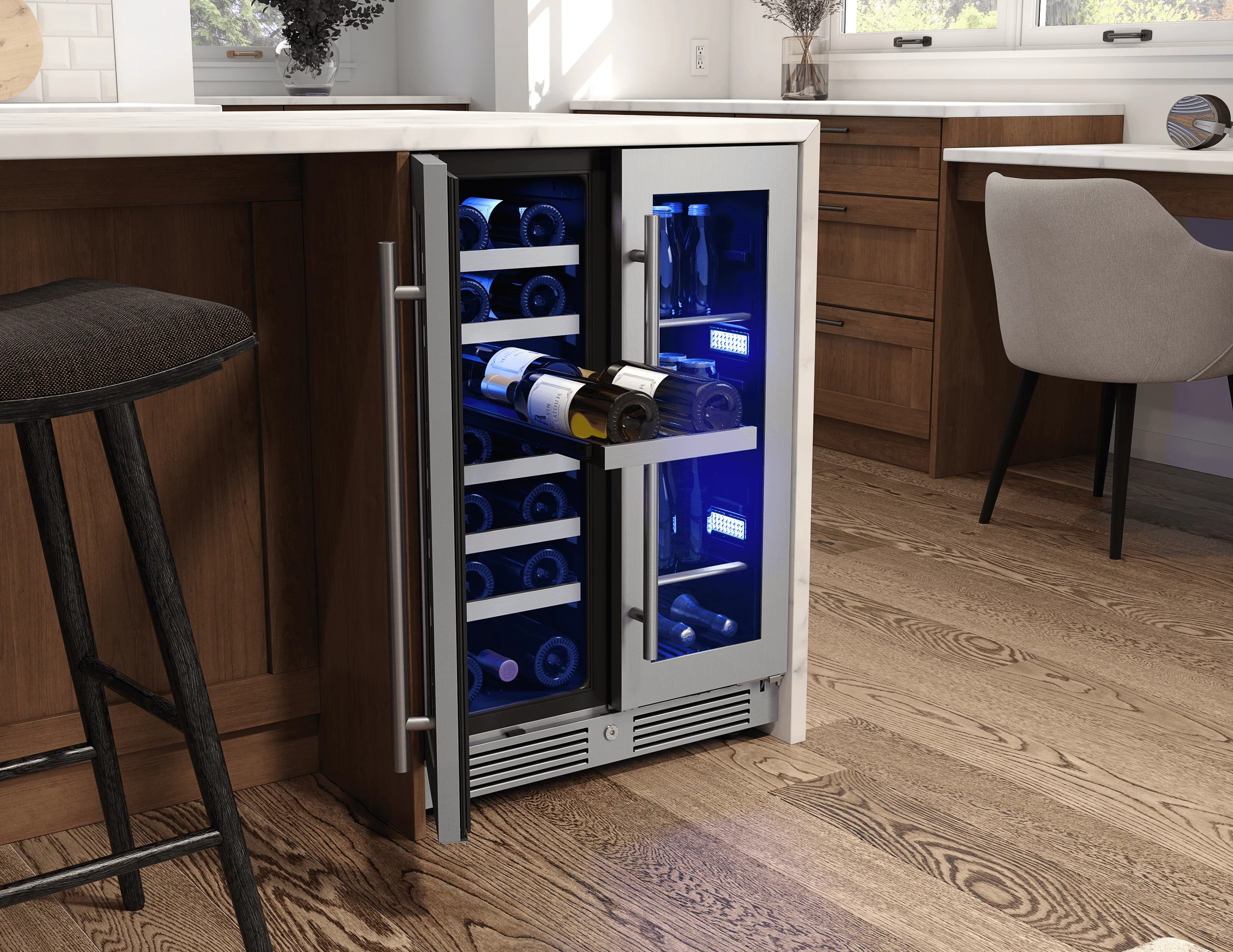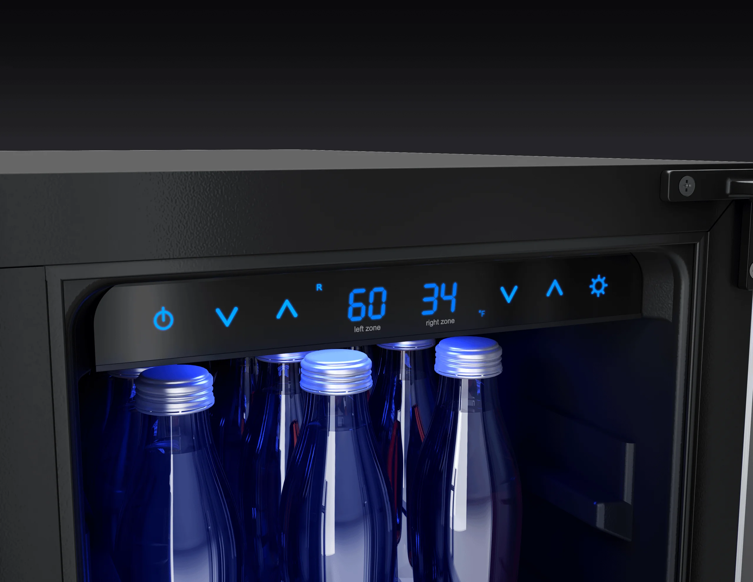 PreciseTemp™, Active Cooling Technology, Vibration Dampening System, Dual-Pane, Low-e Argon-Filled Glass Door, 3 Color LED Lighting, Full-Extension Black Wood Racks, 3-Color Electronic Touch Control