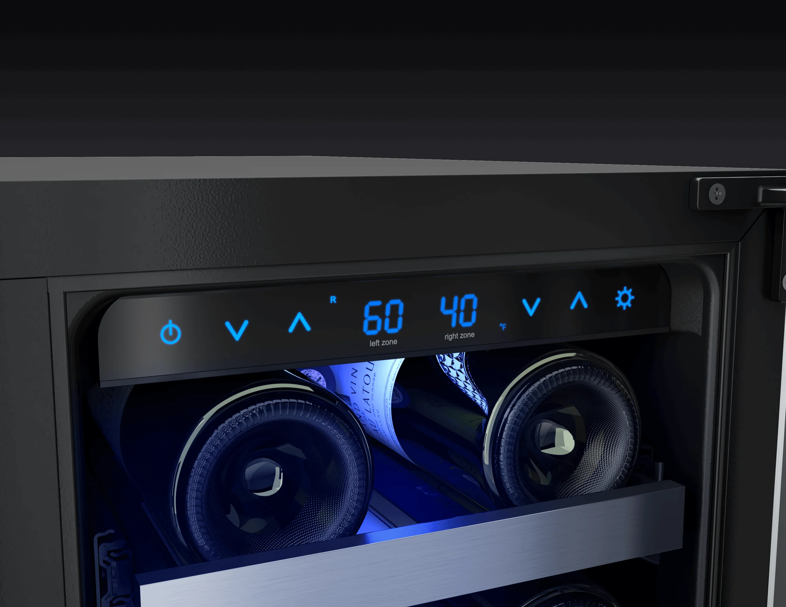 PreciseTemp™, Active Cooling Technology, Vibration Dampening System, Dual-Pane, Low-e Argon-Filled Glass Door, 3 Color LED Lighting, Full-Extension Black Wood Racks, 3-Color Electronic Touch Control