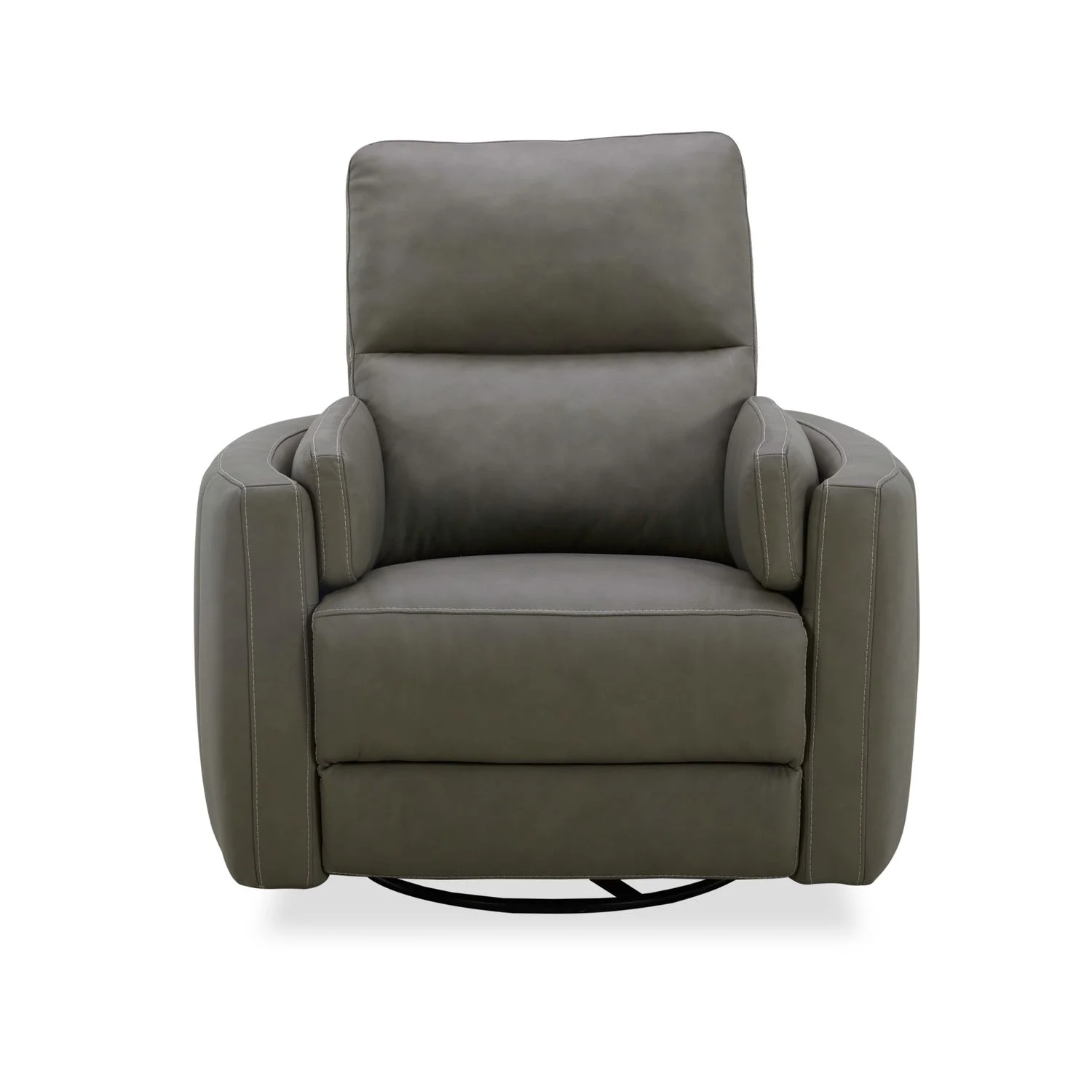 This contemporary swivel glider power recliner is the perfect addition to any living room, offering the ultimate in comfort and relaxation. With its sleek, solid leather upholstery in a beautiful Aline Light Gray color, this recliner is sure to complement any home decor. The convex channeled track arms feature loosely fitted inside-arm pillows, providing extra support and comfort for your arms as you sit back and unwind.