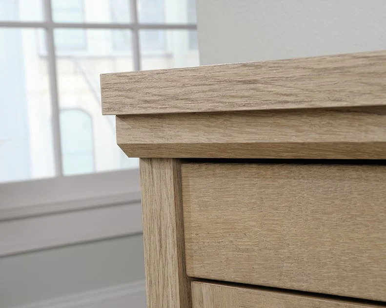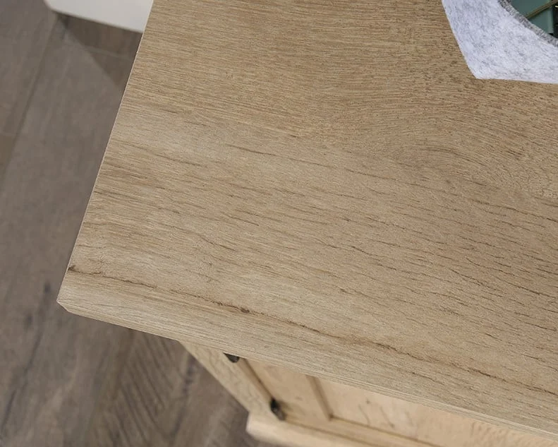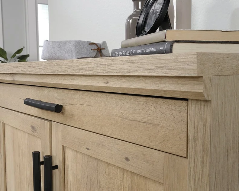moreDurable, 1" thick top. Storage drawer with metal runners and safety stops for smaller home items. Storage behind doors features large adjustable shelf for versatile placement of your items. Meets BIFMA standard x5. 9 for safety, durability, and structural performance. Finished in Prime Oak®.