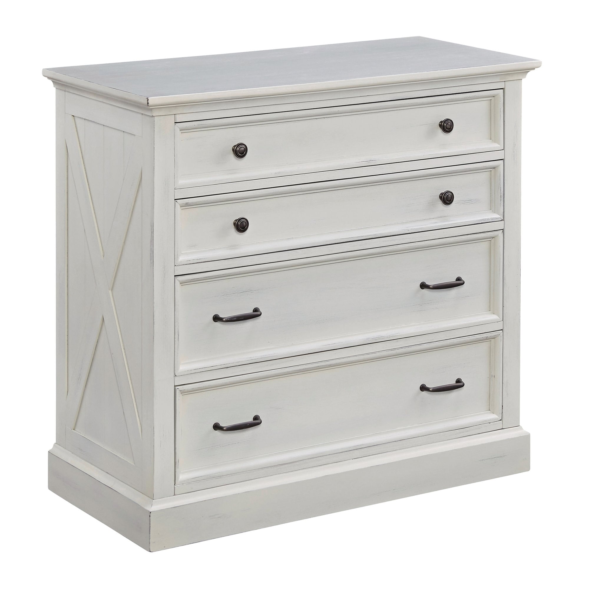 moreBeachside styling inspires the weathered wood look of this chest of drawers. Crafted of mahogany solids and veneers with wire-brushed surfaces. Inset wainscot panels with X-frame design and hand-rubbed white painted finish. Two 3.5”H upper drawers feature a felt-lined bottom and two lower 6.75”H drawers are perfect for deep storage. Industrial-designed drawer pulls feature an antiqued nickel finish. Finish and measurements may vary slightly. Assembly required.
