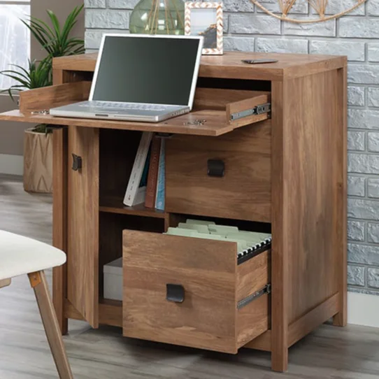 moreThree drawers with full extension slides hold various office supplies Large top drawer/shelf features flip-down panel for keyboard/mouse or laptop Two file drawers hold letter-size hanging files. Storage area behind door holds vertical CPU tower and has an adjustable shelf. Top features herringbone pattern for added detail. Meets BIFMA standard x5. 9 for safety, durability, and structural performance. Finished on all sides for versatile placement in any room of your home. Enclosed back with cord access to prevent cord clutter. Sindoori Mango® finish.