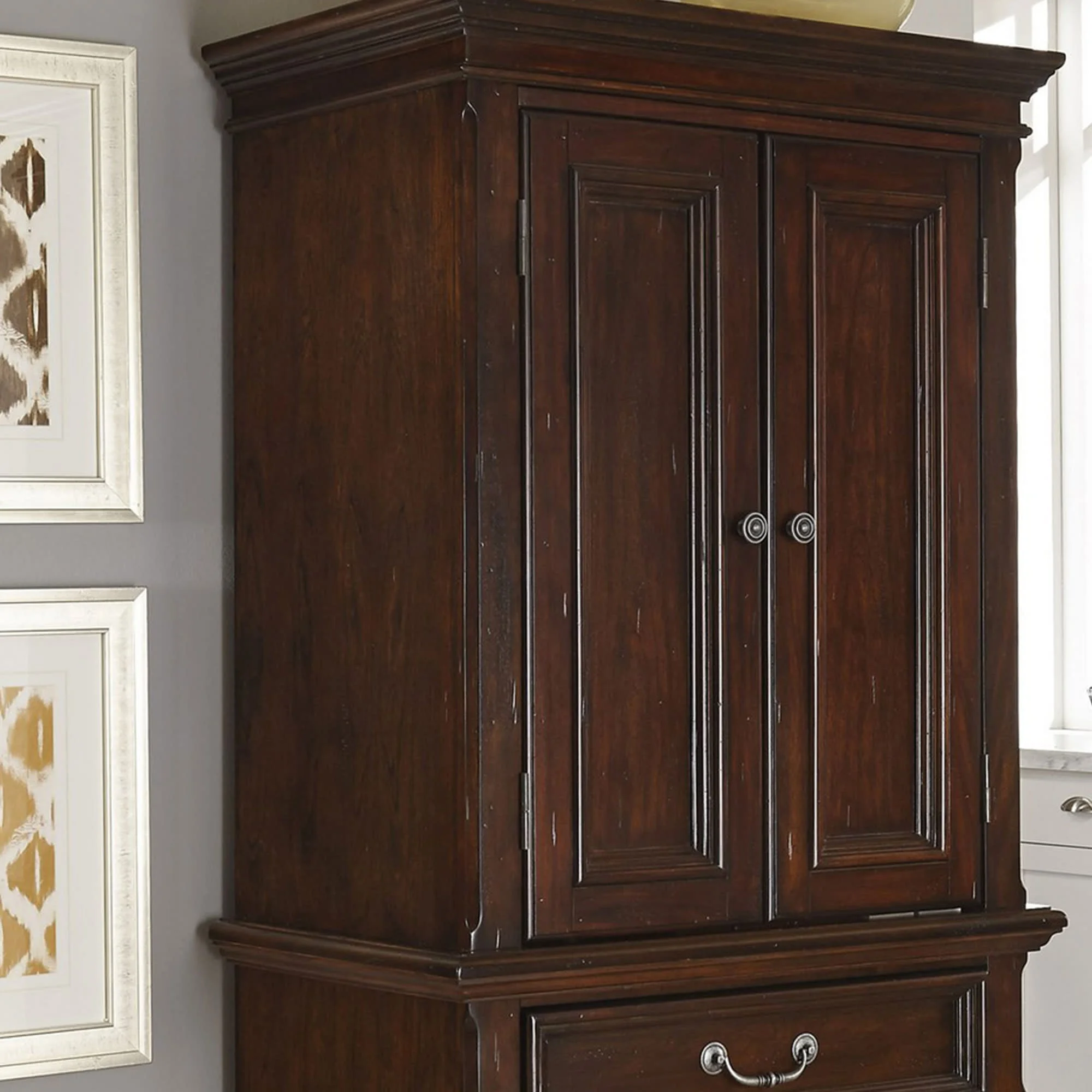Four adjustable shelves in two cabinets and a center drawer store objects of all sizes., Timeless dark cherry finish for a warm and sophisticated look., Veneer provides the beauty and feel of natural woodgrain., Physical distressing creates an aged, well-worn and unique vintage look.