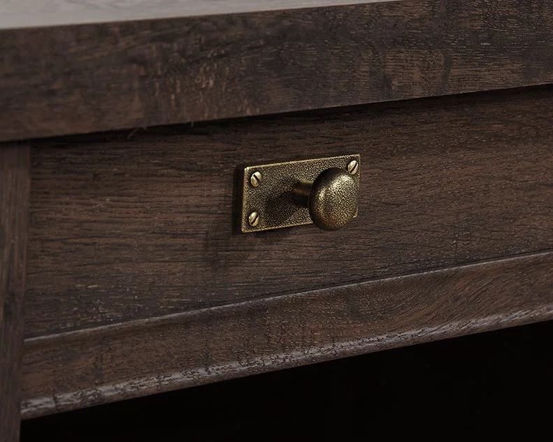 moreDurable, 1" thick top. Pencil drawer and four storage drawers feature metal runners and safety stops. Lower drawers with full extension slides hold letter or European size hanging files so you can stay organized. Cord management includes two desk top grommet holes to keep your cord clutter neatly contained. Framed, slat-front detailing for an extra touch of style. Quick and easy assembly with patented T-lock drawer system – because we know your time is valuable. Meets BIFMA standard x5. 5 for safety, durability, and structural performance. Coffee Oak® finish.