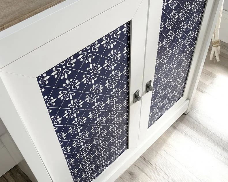 moreThree adjustable shelves for flexible storage options. Hidden storage behind doors helps conceal your clutter and chaos. Door fronts feature decorative tile pattern. Quick and easy assembly with patented slide-on moldings because we know your time is valuable. Soft White® finish with Lintel Oak® accents.