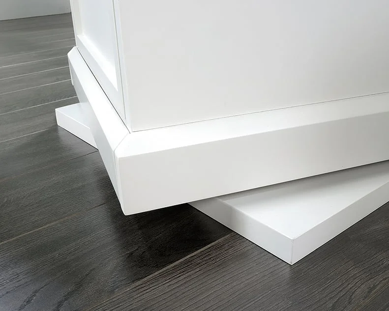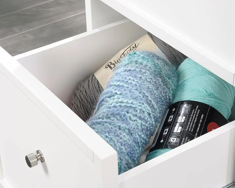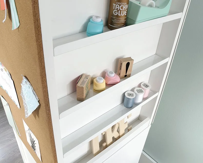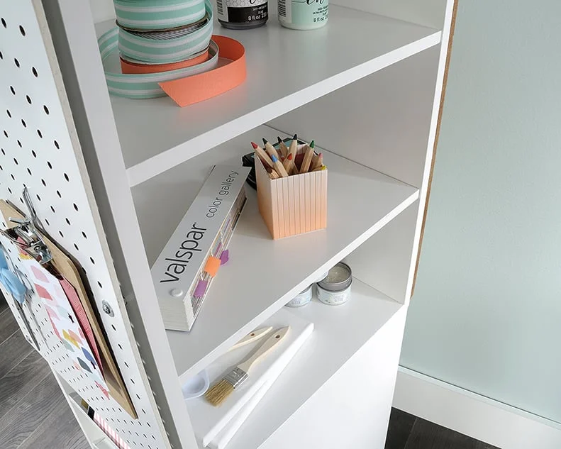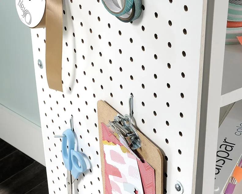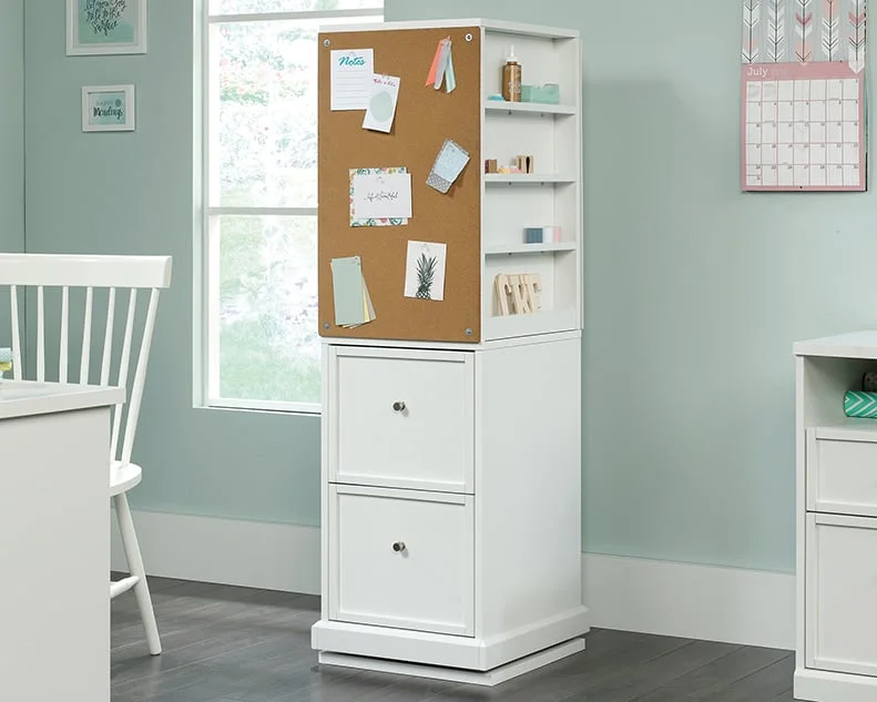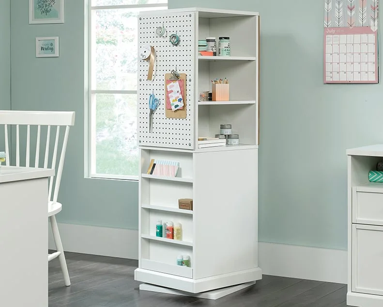 moreNever feel unorganized while crafting again - this craft tower from the Craft Pro Series® has got you covered. Its swivel base allows it to easily spin and turn so you can access the storage spaces on any of the four sides. This versatile, swiveling craft tower includes a pegboard back and a corkboard panel—keeping things organized and easy to reach for when you need them. Two storage drawers with full extension slides offer hidden storage for supplies like yarn, paper, and more. This craft supply storage cabinet features two adjustable shelves, and metal trays for additional storage of glue, scissors, and more. Talk about options! Finished on all sides, this craft cabinet tower will look polished from every angle, no matter which way you spin it. Finished in a sleek White, this handy storage tower gives your craft space the storage and convenience fit for a crafting pro!